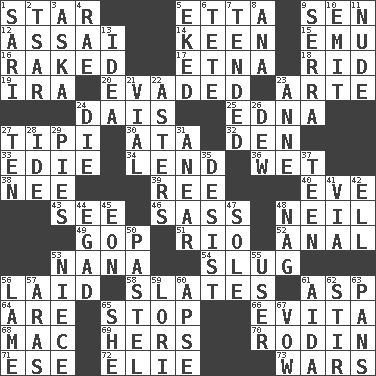 ACROSS 1. Play the lead 5. Singer James 9. Elected rep. 12. Slender Brazilian palm 14. Peachy ____! 15. Australian flightless bird 16. Swept the length of 17. Inactive volcano in Sicily 18. To free from 19. Lyricist Gershwin 20. Eluded 23. Johnson of "Laugh-In" 24. Raised platform 25. Pulitzer Prize-winning author Ferber 27. Native american tent (variation) 30. _ moment's notice (2 wds.) 32. Lair 33. Singer Brickell 34. Grant temporary use of 36. Dripping 38. Born 39. Portuguese money of account (variant) 40. First lady 43. Perceive with the eye 46. Backtalk 48. Famous astronaut Armstrong 49. Grand Old Party 51. River (Sp.) 52. Of or related to the anus 53. Nanny 54. A hard, heavy blow 56. Put down 58. Chalkboards 61. Cleo's killer 64. "We ___ not amused" (Victoria) 65. Cease 66. Webber/Rice musical 68. Big _ 69. Possessive pronoun 70. "The Thinker" sculptor 71. Compass dir. 72. Writer Wiesel 73. Armed conflicts DOWN 1. Indian skirt 2. Russian ruler of old 3. "____ silly question..." 4. Actress Charlotte 5. Made supply last 6. Wig 7. Watched over 8. Santa ___, CA 9. Father Junipero _ 10. Give off 11. Naked 13. It may be bright or harebrained 21. Small bottle 22. Michaelmas daisies 23. Queen of England 1702-14 24. Pass on 26. Morning condensation 27. Nine, plus one 28. Binary compound 29. Sliced desserts 31. Approach 35. Cease 37. Adolescent 41. By way of 42. Pipe bend 44. Mild oath 45. Age 47. Flatfish 48. Tired old horse 50. Soft color 53. Sibling's daughter 55. One who makes use of a thing 56. Unable to walk 57. Caspian sea tributary 59. Australian parrot (variant) 60. Domed church section 61. Opera by Verdi 62. Use a spoon 63. Baking dishes 65. A female animal or person 67. Solemn pledge