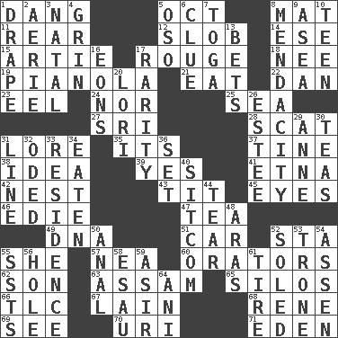 ACROSS 1. Mild oath, euphamism for damn 5. Sep. follower 8. Floor covering 11. Hitchcock's "____ Window" 12. Messy guy 14. Compass dir. 15. Nick name for Arthur 17. Makeup applied to the cheeks 18. Born 19. Player piano 21. Consume 22. One of the 12 tribes of Israel 23. Snakelike fish 24. Not either 25. Ocean 27. _ Lanka 28. Scram, to a cat 31. Old wives' tales, e.g. 35. ___ a Wonderful Life 37. Prong on a fork 38. The main thing one is thinking about 39. It is so 41. Inactive volcano in Sicily 42. A home for chicks 43. Teat (slang) 45. Sight organs 46. Singer Brickell 47. Afternoon social gathering 49. Heredity factor (abbr.) 51. Automobile 52. R.R. building 55. A female animal or person 57. Teachers' org. 60. Speakers 62. Boy, to dad 63. Indian state 65. Grain storage towers 66. Affectionate concern, for short 67. (Had) reclined 68. French philosopher Descartes 69. Observe 70. RI univ. 71. Locale of original sin DOWN 1. Window treatment 2. Nest on high 3. Relating to or accompanying birth 4. Broad smile 5. Bear (Spanish) 6. A slight indication 7. Ancient Roman robe 8. Ananias' fault 9. At sea 10. Adolescent 13. Stakes 16. Immeasurably long periods of time 17. Noteworthy scarcity 20. Australian parrot (variant) 26. First name in cosmetics 29. Singer Murray 30. Beverages made from leaves 31. Actor's bit 32. Wrote a lyric poem 33. Home 34. Consumed 36. Put into a specified state 40. "Cheers" or "Ellen" 44. Pull into pieces 48. Caspian sea tributary 50. Of or related to the anus 52. Having a sole or soles 53. Heavy duty weighing machine 54. NE Netherlands city 55. Fast planes 56. Opening into or through something 58. Son of Isaac 59. SW Saudi Arabia district 61. Become fatigued 64. Cuckoo