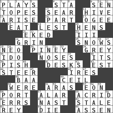 ACROSS 1. Romps 6. R.R. building 9. Elected rep. 12. Drinks excessively 13. Shrivel 14. Hub of activity 15. Get up 16. Piece 17. Double curve, resembling the letter S 18. Ingest 19. For fear that 20. Coop moms 21. Supplemented with great effort 23. One more than two 24. Broad smile 25. Overwhelms 28. Modern: prefix 30. Abounding in pines 34. Jennifer or Joel 35. Wedding promise 36. Olfactory organs 38. It is 39. Expression of disdain 41. Writing tables 43. Eastern Standard Time (abbr.) 44. Navigate 46. Angers 48. Sound made by sheep 49. To provide with a ceiling 50. Past tense of be (plural) 51. Ancient river in northeast Turkey 53. Period of immesurable duration 56. Left side of a ship or aircraft 57. Having or resembling wings 58. Sour-tasting 60. Blunders 61. Political cartoonist Thomas 62. Lacking originality or spontaneity 63. Marina Del _, California 64. Expire 65. NE Netherlands city DOWN 1. Parent Teacher Assoc. 2. Old wives' tales, e.g. 3. Capital of Western Samoa 4. Next before 5. Compass dir. 6. Oceans 7. Small pie 8. Tate display 9. Seigniories (variant) 10. Nights before holidays 11. Born 13. Broke a traffic law 14. Weeding 19. Soviet premier 1918-24 20. Part of HMS, perhaps 22. Monetary unit of Laos 24. Sour, prickly fruit 26. Soaks 27. System (abbr.) 28. Cuts off 29. Prepare for publication 31. Dreamland 32. Compass dir. 33. Consenting reply 37. Atmospheres 40. Centers 42. Indian title of respect (Mr.) 45. Actress Charlotte 47. Opts 49. Draw slowly or heavily 50. Had on 51. Jai _ 52. Raze (variant) 54. Mouths or openings 55. "Death on the ____" 56. For each 57. Plus 58. White ___ sheet 59. Lair