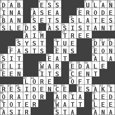 ACROSS 1. Small moist lump or mass 4. Double-curved letter 7. ____ Bator, Mongolia 11. _ tizzy (2 wds.) 12. Toward the sea 13. Wear away 14. Prohibit 15. Puts into a specified state 16. Chalkboards 17. Bobsleighs 19. Helper 21. Direct toward a target or goal 23. Relationship diagram 24. System (abbr.) 25. Third day of the wk. 26. Movie disc 29. Goes without food and/or water 30. Followers of ems 31. Period of immesurable duration 32. Be seated 33. Consume 34. In the manner of 35. Biblical high priest 36. Armed conflict 37. Peak District village in England 40. Car or cant ending 41. ___ a Wonderful Life 42. Penny 43. Old wives' tales, e.g. 45. Often (poetically) 46. Home 51. 1973 Nobel Price Winner (Physics) Leo 55. Speaker 56. Roberta Peters solo 58. Directed 59. Carrier 60. Electrical Unit 61. Area sheltered from the wind 62. SW Saudi Arabia district 63. R.R. building 64. Santa ___, CA DOWN 1. Rights 2. Of or related to the anus 3. Object of repulsion 4. Compass dir. 5. Stalk of a moss capsule 6. Backtalk 7. A salt of uric acid 8. Globular water bottle used in Asia 9. Arabian gulf 10. A home for chicks 12. Aid 13. Otherwise 16. Titles for men of rank and authority 18. 24-hour periods 20. Difficult or unusual or dangerous feat 22. Mountains (abbr.) 24. Smooth fabric 25. Pulls apart 26. Started a card game 27. Short-tailed, large-bodied rat 28. Heredity factor (abbr.) 29. Do some clerical work 32. Observe 33. Ingested 36. One who wires 37. Environmental prefix 38. Outscore 39. Pismires 43. 61 cubic inches 44. Aroma 46. Roll call or roster of names 47. Greek god of love 48. Suttee (variant) 49. Crow sounds 50. Part of Q.E.F. 52. Silent film actress Nazimova 53. Peachy ____! 54. It may be bright or harebrained 57. Call ___ day