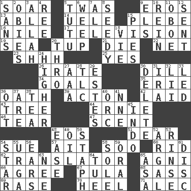 ACROSS 1. Fly high 5. It was, poetically 9. Greek god of love 13. Competent 14. Ubangi River tributary 15. First-year military academy student 16. "Death on the ____" 17. Boob tube 19. Ocean 20. Uncastrated adult male sheep 21. Pass on 22. Fish or hair follower 23. Quiet! 25. It is so 26. Feeling or showing extreme anger 30. Deli pickle 34. Purposes of endeavors 35. 4th largest of the Great Lakes 36. Pledge 39. Gambison 42. Put down 43. Woody plant 44. Bert's buddy 46. Pull apart 47. Aroma 48. Greek goddess of the dawn 51. Letter starter 54. Take to court 57. Small island 58. "Barney Miller" actor Jack 60. To free from 62. Interpreter 65. Hindu god of fire 66. Match 67. Monetary unit of Botswana 68. Backtalk 69. To erase 70. The bottom of a shoe or boot 71. Actor Baldwin DOWN 1. Without 2. Off-Broadway awards 3. Assad's deity 4. To separate or throw off 5. Ballerina skirt 6. Shed a tear 7. Everything 8. Full of seeds 9. Raised railways 10. It's straight from the horse's mouth 11. Mitch Miller's instrument 12. Emitted 15. Sliced desserts 18. Compete 20. Through, poetically 24. Having greater elevation 27. Auto club (abbr.) 28. Affectionate concern, for short 29. _____ Park, CO 30. Keyboard key 31. Retirement account (abbr.) 32. Cards in a Roman deck? 33. Directed 36. Baseball player Mel 37. "We ___ not amused" (Victoria) 38. Beverage made from leaves 40. The grampus (Milton) 41. Compass dir. 45. _ china 48. Comfort 49. Petroleum 50. Staphylococcus 52. Therefore, facetiously 53. Wash lightly 54. Play the lead 55. Capital and largest city of Mongolia 56. Hearing organs 58. Flatfish 59. Of the mouth 61. Plate 63. Born 64. Third day of the wk. 65. White ___ sheet