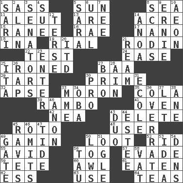 ACROSS 1. Backtalk 5. Player for Phoenix 8. Ocean 11. Eskimo relative 13. "We ___ not amused" (Victoria) 14. 43,560 square feet 15. Indian princess (variant) 16. Actress Charlotte 17. Billionth: prefix 18. _ tizzy (2 wds.) 19. Monetary unit of Yemen 21. "The Thinker" sculptor 22. Trial 24. Relaxation 25. Pressed 27. Sound made by sheep 29. Small pie 30. First class 32. Domed church section 33. Person of subnormal intelligence 35. Root beer relative 39. Role for Stallone 41. Baking chamber 42. Teachers' org. 43. Erase 45. Printing process, for short 48. One who uses or employs something 49. Homeless child 50. Plunder 52. To free from 55. Enthusiastic 56. Coat; cloak 57. Dodge 59. Wig 60. Leather borer 61. Consumed 62. Curvy letter 63. Purpose 64. Afternoon social gatherings DOWN 1. Indian skirt 2. ____ Jay Lerner 3. Legislators 4. Take to court 5. "Two Mules for Sister ____" 6. Mountain range 7. Born 8. Large numbers or amounts 9. Bert's buddy 10. A really long time 12. Laconic 14. Small Philippine buffalo 20. It would 21. 480, 500 or 516 sheets of paper 23. Keyboard key 25. Call ___ day 26. Reproach for some lapse or misdeed 27. Sis' sibling 28. The 18th letter of the Arabic alphabet 30. Adept person 31. Learning spot: Fr. 33. Madame (abbr.) 34. Chief or king in Benin or Nigeria 36. Make much ado about nothing 37. Allow 38. One (Scot) 40. Soon (poet.) 43. Superhero pair 44. First name in cosmetics 45. All-night dance parties 46. Leaves out 47. Event that recurs at intervals 49. Yard entry 50. Moos 51. Stare 53. The main thing one is thinking about 54. Habitations of wild animals 56. The 19th letter of the Greek alphabet 58. Large container