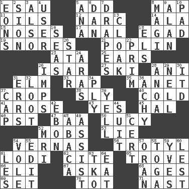 ACROSS 1. He sold his birthright 5. Find the sum of 8. Atlas unit 11. Lubricates 12. Drug cop 14. According to 15. Olfactory organs 17. Of or related to the anus 18. Mild oath 19. Sounds asleep 21. Cotton for raincoats, e.g. 23. "One Day ___ Time" 25. Hearing organs 26. Austrian river, tributary to the Danube 27. What Jean-Claude Killy likes to do 28. Black tropical American cuckoo 31. Shade tree 33. Strike 35. French painter Edouard 37. Riding implement 38. Cunning 40. Chilled 41. Came up 43. It is so 45. Actor Linden 46. Pacific Standard Time (abbr.) 47. Sound made by sheep 50. "I Love _" 52. Disorderly crowds 53. Falsehood 54. Actresses Bloom and Felton 56. TNT 61. Farming town in central California 62. Quote 65. Collection of objects 66. Connecticut Ivy Leaguer 67. "____ silly question..." 68. Eras 69. Arrange properly for use 70. Small child 71. Political cartoonist Thomas DOWN 1. Immeasurably long periods of time 2. The Jewish people; Israel 3. In addition 4. One who uses or employs something 5. Santa ___, CA 6. Daniel's nick name 7. Window treatments 8. Wise men 9. Actor Alda or Thicke 10. Writing tablet 13. Anything that covers or conceals 16. Oceans 18. Raised railways 20. Play the lead 22. Demure 24. Ancient river in northeast Turkey 26. Naughty children 28. Small Philippine buffalo 29. 1994 drama film starring Jodie Foster 30. It would 31. Blunders 32. Spoils 34. Apply oneself diligently 36. Painful 37. Head covering 39. Shout 42. Inky black, to poets 44. Costume for a special activity 48. Phillipine bananalike plant 49. Aid 51. Sure thing 52. Medical imaging device (abbr.) 54. Short-tailed, large-bodied rat 55. Prepare for publication 57. NW Algerian seaport 58. Ancient Roman robe 59. Jacques Cousteau's middle name 60. For fear that 61. French article 63. Ring climax 64. Consume