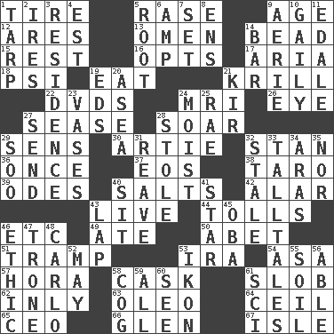 ACROSS 1. Become fatigued 5. Raze (variant) 9. Ripen 12. Ancient Greek god of war 13. Sign of something about to happen 14. Necklace unit 15. Relief 16. Elects 17. Roberta Peters solo 18. Air pressure measure (abbr.) 19. Consume 21. Shrimp-like planktonic crustaceans 22. Movie discs 24. Medical imaging device (abbr.) 26. Sight organ 27. Gospel singer Marvin 28. Fly high 29. Elected reps. 30. Nick name for Arthur 32. Comedian Laurel of Laurel & Hardy 36. Single time 37. Greek goddess of the dawn 38. Pacific island yam 39. Lyric poems 40. Table seasonings 42. Having or resembling wings 43. Not recorded 44. For Whom the Bell _____ 46. And so on (abbr.) 49. Had dinner 50. Collude with 51. _____ steamer (cargo ship) 53. Lyricist Gershwin 54. White ___ sheet 57. Israeli folk dance 58. Keg 61. Oscar Madison type 62. In an inward manner 63. Butter sub 64. To provide with a ceiling 65. Corporate head (abbr.) 66. Small, secluded valley 67. Capri or Wright DOWN 1. Canvas cover 2. Angers 3. Dwelling 4. Eastern Standard Time (abbr.) 5. Carrot, for example 6. Electrical Unit 7. Put into a specified state 8. Followers of ems 9. Nest on high 10. Lightheartedly 11. Peak District village in England 14. Long, evenly shaped piece 19. Begley and Asner 20. At sea 21. Apertif with cassis 23. Flower holders 24. Damp 25. Actress Charlotte 27. Transmit 28. Fur scarf 29. "Barney Miller" actor Jack 31. Rob, plunder, or pillage 32. Having lost freshness 33. Baron Munchausen's specialties 34. Ancient river in northeast Turkey 35. Or not 40. Be seated 41. Play the lead 43. Pet locale 45. Chief or king in Benin or Nigeria 46. Principle of right and wrong 47. Marketplace scale 48. Monte _, Las Vegas Hotel/Casino 52. Can I? 53. Visual representation of an object 55. Land 56. Competent 58. Gear tooth 59. Everything 60. Observe 61. _-fi