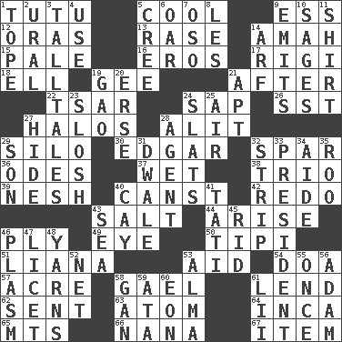 ACROSS 1. Ballerina skirt 5. Calm and collected 9. Double-curved letter 12. Mouths or openings 13. Raze (variant) 14. Wet nurse 15. Diluted with white 16. Greek god of love 17. Swiss mountan, "Queen of the Mountains" 18. Pipe bend 19. Turn to the right 21. Following 22. Russian ruler of old 24. Plant excrement 26. Fast jet (abbr.) 27. Radiant circles of light 28. Set down 29. Grain storage tower 30. _ Allan Poe 32. Practice fight 36. Lyric poems 37. Soggy 38. Musical group of three 39. Tender 40. 2nd pers. sing. pres. of can (arch.) 42. Redecorate 43. Table seasoning 44. Get up 46. Travel a route regularly 49. Sight organ 50. Native american tent (variation) 51. Climbing, woody, usually tropical vines 53. Help 54. ___ good deed 57. Land measure 58. Highlander 61. Grant temporary use of 62. Posted 63. Smallest unit of an element 64. South American Indian 65. Mountains (abbr.) 66. Grandmother 67. Detail DOWN 1. Drink excessively 2. Mountain range 3. Baron Munchausen's specialties 4. Purpose 5. Algonquian 6. Rowing implement 7. Bear (Spanish) 8. French article 9. Gives off 10. Gurus 11. Chest covering 14. Sandy's bark 19. E Mali city 20. Celtic language 21. Fitting 23. Agitate, as a liquid 24. Narrow boards 25. Atmosphere 27. Flintstone garb 28. Representative 29. Manchild 31. A sleeping potion; an opiate (poet.) 32. Empty completely 33. Elected leader of a country 34. Assistant 35. Friend of Pooh 40. Island 41. Jacques of French films 43. Ocean 45. To free from 46. Suffix with ecto or cyto 47. It is permitted: Lat. 48. Tall tales 52. Fish or hair follower 53. _ mater 55. At one time in the past 56. First of billions? 58. Separate the seeds from cotton 59. _ moment's notice (2 wds.) 60. Age 61. Cards in a Roman deck?