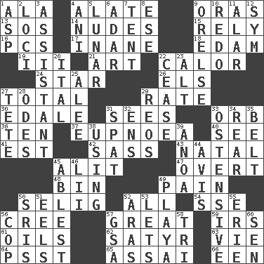 ACROSS 1. In the manner of 4. Having winglike extensions 9. Mouths or openings 13. Distress signal 14. Unclothed pictures 15. Depend 16. Personal Computers (abbr.) 17. Silly 18. Dutch treat 19. One more than two 21. Nonscientific branch of learning 22. Bodily heat indicating an inflammation 24. Play the lead 26. Raised railways 27. "_____ Recall" 29. Assign a rank or rating to 30. Peak District village in England 31. Observes 33. Globe 36. Nine, plus one 37. Normal relaxed breathing 40. Perceive with the eye 41. Eastern Standard Time (abbr.) 42. Backtalk 43. Brizilian seaport 45. Set down 47. Unconcealed 48. Storage container 49. Ache 50. Major League Baseball Commissioner Bud 52. Everything 54. Compass dir. 56. Algonquian 57. Relatively large 59. Big collection agency 61. Lubricates 62. Letch 63. Compete 64. Inconspicuous attention getter 65. Slender Brazilian palm 66. Car or cant ending DOWN 1. Cleo's killer 2. Venues 3. Helper 4. Cuckoo 5. Type of eclipse 6. The sixth month of the Jewish calendar 7. Portable shelter 8. Compass dir. 9. Threatening words 10. Do over again 11. Having or resembling wings 12. Symbol (abbr.) 20. Slanted text style (abbr.) 22. Stop 23. The first octave above the treble staff 25. Toward shelter 27. Wig 28. Lyric poems 29. Vintage cars 31. Argument over a trivial matter 32. Followers of ems 33. Clearly or manifestly demonstrative 34. Located in or toward the back 35. Waist strap 38. Putting into practice 39. Small Philippine buffalo 44. Opinion 45. Most capable 46. Cards in a Roman deck? 49. Beach, in Buenos Aires 50. Indian titles of respect 51. Snakelike fish 52. Ancient river in northeast Turkey 53. Allows 55. One of the Great Lakes 56. Police officer (slang) 57. Girls' org. (abbr.) 58. Three (prefix) 60. Elected rep.