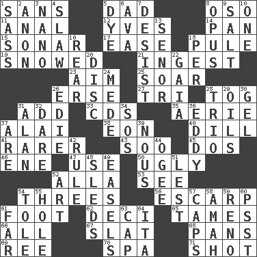 ACROSS 1. Without 5. Male parent 8. Bear (Spanish) 11. Of or related to the anus 12. Jacques Cousteau's middle name 14. Baking dish 15. Echolocation 17. Comfort 18. Whine 19. Overwhelmed 21. Consume 23. Direct toward a target or goal 25. Fly high 26. Celtic language 27. Three (prefix) 28. Coat; cloak 31. Find the sum of 33. Music discs 35. Nest on high 37. Mountain range southwest of Kyrgyzstan 38. Period of immesurable duration 40. Deli pickle 41. More valued for its uncommonness 43. "Barney Miller" actor Jack 45. Two (Sp.) 46. Compass dir. 47. Purpose 50. Repulsive 52. Silent film actress Nazimova 53. Observe 54. Trios 56. Fortification 61. 12 inches 62. Tenth: prefix 65. Domesticates 66. Everything 67. Narrow board 68. Zero-star reviews 69. To sift 70. Health resort 71. Guess DOWN 1. Backtalk 2. Soon (poet.) 3. Billionth: prefix 4. Cole _ (cabbage dish) 5. Color 6. Actress Gardner 7. Cease 8. Musical composition 9. Table seasoning 10. Single 13. Sir (Sp.) 16. Located in or toward the back 18. For each 20. Flat circle 22. Greek goddess of the earth (variant) 24. Ancient Persian 26. Singer Brickell 28. Musical group of three 29. Petroleums 30. Set 31. Actor Alda or Thicke 32. Have the gumption 34. Mayday 36. Whirlpool 37. "We ___ not amused" (Victoria) 39. Good sense 42. Court order 44. Double curve, resembling the letter S 48. Bobsleighs 49. Artist's stands 51. For fear that 52. Tate display 54. Lacquered or enameled metalware 55. Opening into or through something 57. Balmoral and tarboosh 58. Wet nurse 59. Former U.S. Attorney General Janet 60. Inconspicuous attention getter 61. At a great distance 63. Head covering 64. Call ___ day