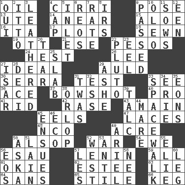 ACROSS 1. Petroleum 4. High-altitude cloud 9. Airs 13. Shoshoni 14. Approach 15. _ vera 16. Call ___ day 17. Ground plans 18. Stitched 19. Baseball player Mel 21. Compass dir. 22. Mexican monetary units 24. Command 26. Area sheltered from the wind 27. Standard of perfection 29. Old (Scot.) 30. Father Junipero _ 31. Trial 33. Observe 36. Adept person 37. The distance a bow sends an arrow 40. Adept person 41. To free from 42. To erase 43. At full speed 45. Snakelike fish 47. Shoestrings 48. Non-commissioned officer (abbr.) 49. 1/640 square mile 50. Columnist Joseph or Stewart 52. Armed conflict 54. She-sheep 56. He sold his birthright 57. Soviet premier 1918-24 59. 100% 61. Migrant worker of the '30s 62. First name in cosmetics 63. Whopper 64. Without 65. Vertical member of a panel or frame 66. Cask DOWN 1. Fr. "Yes" 2. "Tell ____ the Marines!" 3. Tough but pliablecoriaceous 4. Head covering 5. An arm off of a larger body of water 6. Vintage cars 7. Assign a rank or rating to 8. Big collection agency 9. Went by 10. Margarine 11. Sty mamas 12. Car or cant ending 20. Rend 22. Greek god of the underworld 23. Snakelike fish 25. Thick slice 27. Austrian river, tributary to the Danube 28. Tenth: prefix 29. American tennis player Robert 31. It was, poetically 32. Double-curved letter 33. High altitude stroll 34. One of the Great Lakes 35. Immeasurably long periods of time 38. Fourth or lowest deck 39. Baby powder 44. Female horse 45. Takes place subsequently 46. Environmental prefix 49. Satellite of Uranus 50. "____ silly question..." 51. (Had) reclined 52. Compass direction 53. Opposed to 55. Writer Wiesel 56. Greek goddess of the dawn 57. French article 58. Born 60. Part of a journey