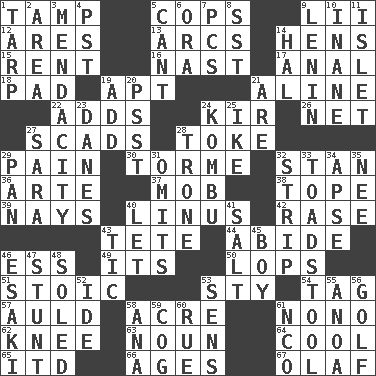 ACROSS 1. Pack (down) 5. 911 reaches them 9. Cards in a Roman deck? 12. Ancient Greek god of war 13. Curves 14. Coop moms 15. Monthly bill 16. Political cartoonist Thomas 17. Of or related to the anus 18. Writing tablet 19. Fitting 21. Place in a line 22. Does sums 24. Apertif with cassis 26. Fish or hair follower 27. Loads 28. Puff or smoke 29. Ache 30. Singer Mel 32. Comedian Laurel of Laurel & Hardy 36. Johnson of "Laugh-In" 37. Disorderly crowd 38. Drink excessively 39. Negative votes 40. "_ and Lucy" (Charlie Brown theme song) 42. To erase 43. Wig 44. Tolerate 46. Curvy letter 49. ___ a Wonderful Life 50. Chops off 51. Unemotional 53. Filthy place 54. Label 57. Old (Scot.) 58. Land measure 61. Words to Nanette 62. Leg joint 63. Part of speech 64. Calm and collected 65. It would 66. Eons 67. Norwegian king DOWN 1. Canvas cover 2. Length times width 3. Ananias' fault 4. Pacific Standard Time (abbr.) 5. Patter 6. Mouth or opening 7. Personal Computers (abbr.) 8. Fast jet (abbr.) 9. Soviet premier 1918-24 10. Lacking in sense or substance 11. Small island 14. Actor Linden 19. Find the sum of 20. Inconspicuous attention getter 21. "We ___ not amused" (Victoria) 23. Natives or inhabitants of Denmark 24. Dried seaweed eaten as food 25. Eisenhower's nickname 27. "Two Mules for Sister ____" 28. Marketplace scale 29. Baking dish 31. Leaves out 32. Empty completely 33. Inedible or poisonous agaric 34. Domed church section 35. Born 40. Allow 41. Table seasoning 43. Nervous spasm 45. Male child 46. 1973 Nobel Price Winner (Physics) Leo 47. Check the growth or development of 48. Having a sole or soles 52. Binary compound 53. Elected reps. 55. Small Philippine buffalo 56. Eighteen holes 58. Santa ___, CA 59. Gear tooth 60. Regret 61. Non-commissioned officer (abbr.)