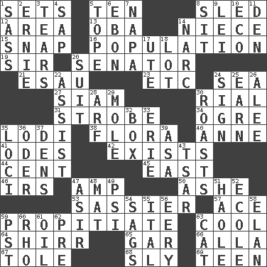 ACROSS 1. Arranges properly for use 5. "___ Little Indians" 8. Downhill vehicle 12. Length times width 13. Chief or king in Benin or Nigeria 14. Sibling's daughter 15. Fastener 16. Census information 19. Title for a knight 20. Legislator 21. He sold his birthright 23. And so on (abbr.) 24. Ocean 27. Thailand, formerly 30. Monetary unit of Yemen 31. Disco prop 34. Legendary monster 35. Farming town in central California 38. Plants 40. Singer Murray 41. Lyric poems 42. Has an existence 44. Penny 45. 90 degrees 46. Big collection agency 47. Electrical Unit 50. American tennis player Robert 53. More lively and spirited 57. Adept person 59. Conciliate 63. Calm and collected 64. Bake eggs in their shells 65. Slender fish 66. Silent film actress Nazimova 67. Lacquered or enameled metalware 68. Playfully artful 69. Adolescent DOWN 1. Backtalk 2. Bert's buddy 3. Lacerates 4. Plant excrement 5. Drink excessively 6. Inky black, to poets 7. California wine valley 8. Be seated 9. Flowery wreath 10. Environmental prefix 11. Lair 14. Drug cop 17. Shoshoni 18. Car dealer's back yard 20. Costume for a special activity 22. Aid 24. Omen 25. Merit 26. Toward shelter 28. Sandy's bark 29. Undercover agent 30. Ridicules or criticizes harshly 32. Gift holder 33. One of the Great Lakes 35. Venues 36. River in Europe 37. Lairs 39. White ___ sheet 43. Russian ruler of old 47. SW Saudi Arabia district 48. Floor protector 49. 23rd letter of the Greek alphabet 51. White Person, in Hawaii 52. Learning spot: Fr. 54. Droops 55. Slanted text style (abbr.) 56. Suggestive of the supernatural 58. Flair 59. Pacific Standard Time (abbr.) 60. 17th letter of the Greek alphabet 61. Lubricate 62. Before (prefix) 63. Domesticated feline