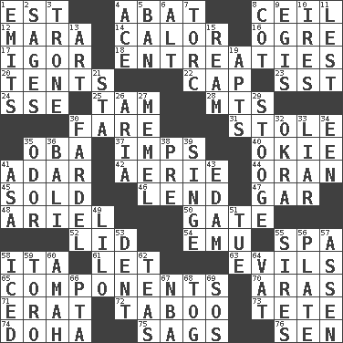 ACROSS 1. Eastern Standard Time (abbr.) 4. Blind as ____ 8. To provide with a ceiling 12. Hindu Mythology: god of death 14. Bodily heat indicating an inflammation 16. Legendary monster 17. Russian composer Stravinsky 18. Pleas 20. Portable shelters 22. Head covering 23. Fast jet (abbr.) 24. Compass dir. 25. Scottish cap 28. Mountains (abbr.) 30. Conductor's collection 31. Fur scarf 35. Chief or king in Benin or Nigeria 37. Naughty children 40. Migrant worker of the '30s 41. The sixth month of the Jewish calendar 42. Nest on high 44. NW Algerian seaport 45. Disposed of to a purchaser 46. Grant temporary use of 47. Slender fish 48. Satellite of Uranus 50. Yard entry 52. Flaplike covering 54. Australian flightless bird 55. Health resort 58. Call ___ day 61. Allow 63. Vices 65. Parts 70. Caspian sea tributary 71. Part of Q.E.F. 72. Off limits 73. Wig 74. Capital of the state of Qatar 75. Droops 76. Elected rep. DOWN 1. Sends forth 2. Gurus 3. Marketplace scale 4. Adept person 5. Prohibit 6. The first octave above the treble staff 7. Torque (variant) 8. Small bed 9. The front part of a cuirass 10. Angers 11. For fear that 13. Tate display 15. 480, 500 or 516 sheets of paper 19. Tenement units (abbr.) 21. R.R. building 26. Operatic vocal solo 27. Klaipeda city 29. Moe Howard, for one 30. Bundle 32. Gumbo ingredient 33. One who doesn't tell the truth 34. Car or cant ending 35. Scent 36. Indonesian resort city 38. Before (prefix) 39. Scorch 41. White ___ sheet 43. Dutch treat 49. _ and Stitch 51. Third day of the wk. 53. Gouge 55. Begets 56. Food holder 57. NE Netherlands city 58. On the rocks 59. "Corrida" creature 60. Nursemaid 62. Afternoon social gatherings 64. Large container 66. Parent Teacher Assoc. 67. Basketball assoc. 68. Coat; cloak 69. Mayday