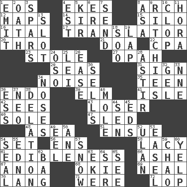 ACROSS 1. Greek goddess of the dawn 4. Makes supply last 8. Bowlike part 12. Atlas contents 14. Title for a man of rank and authority 15. Grain storage tower 16. Slanted text style (abbr.) 17. Interpreter 20. Through, poetically 21. ___ good deed 22. Tax preparer (abbr.) 23. Fur scarf 27. Brightly colored fish 29. Oceans 31. Public display of a written message 34. Annoying sound 35. Adolescent 36. Inside; within (prefix) 39. Shade tree 41. Small island 42. Perceives with the eye 43. Failure 46. Not divided or shared with others 47. Downhill vehicle 48. Toward the sea 51. Take place subsequently 54. Put into a specified state 56. Followers of ems 58. Made of lace 61. The property of being fit to eat 66. American tennis player Robert 67. Small Philippine buffalo 68. Migrant worker of the '30s 69. Be tempered by heat 70. Austrian-born American filmmaker Fritz 71. We are 72. Chop off DOWN 1. Send forth 2. Pledge 3. Practice fights 4. Eastern Standard Time (abbr.) 5. Apertif with cassis 6. Epoch 7. Post 8. White ___ sheet 9. Actors Guy, Robert Welles, and Clint 10. Hoof sound 11. Israeli folk dance 13. Narrow, elongated depression 18. "Barney Miller" actor Jack 19. Infant locale 24. Bear (Spanish) 25. Flowery wreath 26. Relaxation 28. Moving about 30. Exchanges for money 32. Set 33. Compass dir. 34. Olfactory organs 36. Double-curved letter 37. Modern: prefix 38. Conveyance 40. Undercover agent 44. Elected rep. 45. Begley and Asner 49. Snakelike fish 50. One (Scot) 52. ____ Bator 53. Artist's stand 54. Lick closed 55. Pulitzer Prize-winning author Ferber 57. Overwhelm 59. US Secretary of Labor Elaine L. _ 60. Sharp bark 62. Container for groceries 63. Supplement with great effort 64. Title for a knight 65. Perceive with the eye