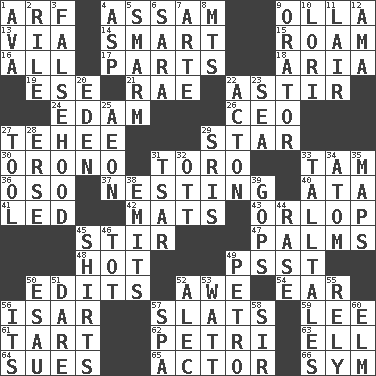 ACROSS 1. Sandy's bark 4. Indian state 9. Rounded earthenware pot or jar 13. By way of 14. Don Adams' spy role 15. Wander aimlessly 16. Everything 17. Actors' quests 18. Roberta Peters solo 19. Compass dir. 21. Actress Charlotte 22. Having gotten out of bed 24. Dutch treat 26. Corporate head (abbr.) 27. Giggle 29. Play the lead 30. U. of Maine site 31. "Corrida" creature 33. Scottish cap 36. Bear (Spanish) 37. Nestling 40. _ moment's notice (2 wds.) 41. Directed 42. Floor coverings 43. Lowest deck of a ship 45. Commotion 47. Insides of hands 48. Being at a high temperature 49. Inconspicuous attention getter 50. Prepares for publication 52. Deep reverence 54. Hearing organ 56. Austrian river, tributary to the Danube 57. Narrow boards 59. Area sheltered from the wind 61. Small pie 62. _ dish (used to culture cells) 63. Pipe bend 64. Institutes legal proceedings 65. Thespian 66. Symbol (abbr.) DOWN 1. Actress Gardner 2. Cause heat under the collar 3. It jiggles the polygraph 4. Viper 5. Excessive but superficial compliments 6. "Two Mules for Sister ____" 7. Johnson of "Laugh-In" 8. Mountains (abbr.) 9. Speaker 10. Australian parrot (variant) 11. Den 12. Housemaid (var.) 20. Locale of original sin 22. 13-14th century defensive garment 23. Ocean 25. Period of immesurable duration 27. Implement 28. Celtic language 29. Indian titles of respect 31. Russian ruler of old 32. Baseball player Mel 33. Baron Munchausen's specialties 34. Tiny particle 35. Atlas contents 38. Sends forth 39. Republicans 44. Raze (variant) 45. Chest coverings 46. Small child 49. Stone: prefix 50. Son of Isaac 51. Have the gumption 52. Actor Baldwin 53. Electrical Unit 55. Depend 56. ___ a Wonderful Life 57. Health resort 58. Title for a knight 60. Shade tree