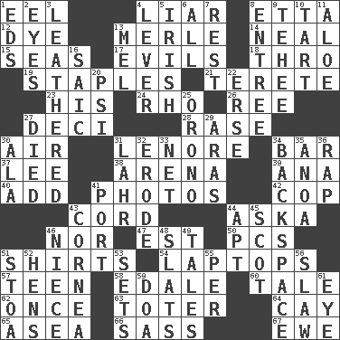 ACROSS 1. Snakelike fish 4. One who doesn't tell the truth 8. Singer James 12. Color 13. Haggard of country music 14. Actress Patricia 15. Oceans 17. Vices 18. Through, poetically 19. Paper fasteners 21. Cigar-shaped 23. Part of HMS, perhaps 24. 17th letter of the Greek alphabet 26. To riddle 27. Tenth: prefix 28. Raze (variant) 30. Wind 31. Poe poem 34. Drinking establishment 37. Area sheltered from the wind 38. Sports stadium 39. Santa ___, CA 40. Say or write further 41. Pictures 42. Police officer (slang) 43. Drawstring 44. "____ silly question..." 46. And not 47. Eastern Standard Time (abbr.) 50. Personal Computers (abbr.) 51. Upper-body garments 54. Portable computers 57. Adolescent 58. Peak District village in England 60. Falsehood 62. Single time 63. Carrier 64. Island 65. Toward the sea 66. Backtalk 67. She-sheep DOWN 1. Begley and Asner 2. Snake ____ (dice throw) 3. Resembling or made to resemble leather 4. Prying instrument 5. From or relating to Ireland 6. 100% 7. Respite 8. Main course 9. Giggle 10. Small pie 11. _ vera 13. Cartoonist voice _ Blanc 16. Ketch in the Levant 20. 23rd letter of the Greek alphabet 22. Celtic language 25. U. of Maine site 27. Passed on 29. Ancient river in northeast Turkey 30. Chicken ___ king 31. Cowardly lion portrayer 32. Wear away 33. Fish or hair follower 34. Keyboard key 35. Small Philippine buffalo 36. Reproach for some lapse or misdeed 41. Left side of a ship or aircraft 43. Pupil covering 44. Fitting 45. Native of Scotland 46. Sibling's daughter 48. Narrow boards 49. Stories 51. Portico 52. Coop moms 53. Arranges properly for use 55. For each 56. Cole _ (cabbage dish) 59. ___ good deed 61. Sight organ