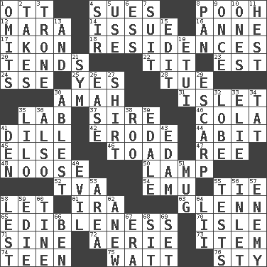 ACROSS 1. Baseball player Mel 4. Takes to court 8. "Silly old bear" 12. Hindu Mythology: god of death 14. Come out of 16. Queen of England 1702-14 17. Image 18. Homes 20. Looks after 22. Teat (slang) 23. Eastern Standard Time (abbr.) 24. Compass dir. 25. It is so 28. Third day of the wk. 30. Wet nurse 31. Small island 35. Experiment locale 37. Father 40. Root beer relative 41. Deli pickle 42. Wear away 44. "This won't hurt ____!" 45. Otherwise 46. Frog relative 47. To sift 48. Trap for birds or small mammals 50. Desk light 52. Federal power corp. 54. Australian flightless bird 55. Neckwear 58. Allow 61. Lyricist Gershwin 63. American astronaut and politician John 65. The property of being fit to eat 70. Small island 71. Trig term 72. Nest on high 73. A distinct part 74. Adolescent 75. Electrical Unit 76. Filthy place DOWN 1. Leaves out 2. Receives possession of 3. Heavy duty weighing machine 4. Title for a knight 5. Purpose 6. Curvy letter 7. Set of matching outer garments 8. Baking dish 9. At one time in the past 10. Singles 11. Command 13. Also 15. Prepare for publication 19. Needle holder 21. Symbol (abbr.) 26. Comfort 27. Chest covering 29. Fortification 30. Most capable 32. Ear part 33. Writer Wiesel 34. Make lace 35. _ and Stitch 36. In addition 38. Friend of Pooh 39. Peak District village in England 41. Lair 43. Dutch treat 49. Tending to cause great harm 51. Large cup 53. Type of rug 55. Trials 56. An arm off of a larger body of water 57. Foe 58. For fear that 59. Singer Brickell 60. Prong on a fork 62. Afresh 64. Cards in a Roman deck? 66. Benjamin's nick name 67. Epoch 68. Be seated 69. Put into a specified state