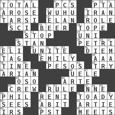 ACROSS 1. "_____ Recall" 6. Personal Computers (abbr.) 9. Parent Teacher Association (abbr.) 12. Came up 13. Chinese city south-southwest of Nanjing 14. SW Asia republic 15. Tarsus (plural) 16. Liveliness 17. Hero or heavy, e.g. 18. _-fi 19. Fermented drink made from hops 20. Drink excessively 21. Constrict 23. Single; one (prefix) 24. Comedian Laurel of Laurel & Hardy 25. _ dish (used to culture cells) 28. Biblical high priest 30. Join together 34. South Vietnam president (1954) 35. Label 36. Poet Dickinson 38. Auto club (abbr.) 39. Prong on a fork 41. Mexican monetary units 43. Attempt to accomplish something 44. Believer in; advocate of (suffix) 46. Ubangi River tributary 48. Bear (Spanish) 49. Johnson of "Laugh-In" 50. Ship's personnel 51. Governing power 53. Compass dir. 56. Silvers or Donahue 57. Painter Guido (1575-1642) 58. Sycophant 60. Observes 61. "This won't hurt ____!" 62. Nick name for Arthur 63. Big collection agency 64. Pacific Standard Time (abbr.) 65. Confronts DOWN 1. Make lace 2. Mouths or openings 3. Torque (variant) 4. Help 5. Flowery wreath 6. Whine 7. Burn to charcoal 8. Player for Phoenix 9. Appease 10. Falsehood 11. A saturated hydrocarbon 13. Shed a tear 14. Pressed 19. Child's nurse 20. Uncastrated adult male sheep 22. The 19th letter of the Greek alphabet 24. Seigniories (variant) 26. Posterior 27. "If ____ say so..." 28. Singer James 29. Den 31. Naughty child 32. Standoff 33. Raised railways 37. You are 40. Artist's stands 42. Arrange properly for use 45. At this time 47. Poe poem 49. Set down 50. "Mermaids" star 51. Confederate soldiers (slang) 52. A single undivided whole 54. Nathan's nickname 55. Prepare for publication 56. Air pressure measure (abbr.) 57. Hit sharply and swiftly 58. Scottish cap 59. Affirmative reply