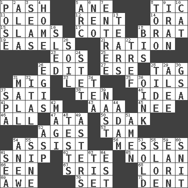 ACROSS 1. Romantic infatuation 5. One (Scot) 8. Nervous spasm 11. Butter sub 12. Monthly bill 14. Mouth or opening 15. Shuts with force 17. ____ d'Azur (French Riviera) 18. Naughty child 19. Artist's stands 21. Food allowance for one day 23. Greek goddess of the dawn 25. Blunders 26. Prepare for publication 27. Compass dir. 28. Label 31. Russian fighter aircraft 33. Allow 35. Fencing necessities 37. Suttee (variant) 38. "___ Little Indians" 40. It may be bright or harebrained 41. Suffix with ecto or cyto 43. Auto club (abbr.) 45. Born 46. 100% 47. "One Day ___ Time" 50. Neighbor of Neb. 52. Eras 53. Scottish cap 54. Aid 56. Makes clutter 61. Clip 62. False hair 65. Pitcher Ryan 66. Car or cant ending 67. Indian titles of respect 68. Australian parrot (variant) 69. Deep reverence 70. Arrange properly for use 71. Incision DOWN 1. Introduce or present, as a question 2. Silent film actress Nazimova 3. Oceans 4. Residence 5. Curve 6. Modern: prefix 7. Main course 8. "Corrida" creature 9. SW Asia republic 10. Domesticated feline 13. Lacerates 16. Downhill vehicle 18. Twice 20. Land 22. Not kosher 24. Proofreading order 26. The front part of a cuirass 28. Periodic rise and fall of the sea level 29. Toward shelter 30. Girls' org. (abbr.) 31. Promenade 32. Slanted text style (abbr.) 34. Afternoon social gathering 36. Pig sound 37. Health resort 39. Political cartoonist Thomas 42. Wise men 44. First of billions? 48. Trials 49. Michaelmas daisies 51. So be it 52. Viper 54. Afresh 55. Trig term 57. Disposed of to a purchaser 58. _ gin 59. Merit 60. In a ____ (agitated or irritated) 61. Ocean 63. Neckwear 64. Eastern Standard Time (abbr.)