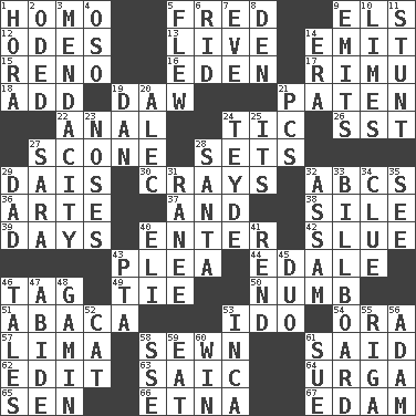 ACROSS 1. Same (prefix) 5. Flintstone 9. Raised railways 12. Lyric poems 13. Not recorded 14. Give off 15. Former U.S. Attorney General Janet 16. Genesis locale 17. Tall New Zealand timber tree 18. Find the sum of 19. Obsolete 21. Eucharist need 22. Of or related to the anus 24. Nervous spasm 26. Fast jet (abbr.) 27. Biscuitlike quick bread 28. Arranges properly for use 29. Raised platform 30. Trading vessels 32. Lettered men learn these first 36. Johnson of "Laugh-In" 37. Added to 38. Filth; sediment 39. 24-hour periods 40. Keyboard key 42. Change direction abruptly 43. Entreaty 44. Peak District village in England 46. Label 49. Neckwear 50. Unfeeling 51. Phillipine bananalike plant 53. Wedding promise 54. Mouth or opening 57. Pale green bean 58. Stitched 61. Expressed in words 62. Prepare for publication 63. Ketch in the Levant 64. Capital and largest city of Mongolia 65. Elected rep. 66. Inactive volcano in Sicily 67. Dutch treat DOWN 1. Israeli folk dance 2. Wrote a lyric poem 3. Ananias' fault 4. Bear (Spanish) 5. Soared 6. To free from 7. Night before a holiday 8. Lair 9. Sends forth 10. Citrus fruits 11. Check the growth or development of 14. Period 19. Daniel's nick name 20. Actor Baldwin 21. Personal Computers (abbr.) 23. Olfactory organs 24. Miss Universe 1986, Barbara Palacios _ 25. It is 27. "Two Mules for Sister ____" 28. Before Barbara or Clara 29. June honoree 31. The wife of a rajah (variant) 32. Indian state 33. Big road sign 34. A slight indication 35. Perceive with the eye 40. Biblical high priest 41. Tear apart 43. Parent Teacher Association (abbr.) 45. Superhero pair 46. Stories 47. Stay 48. Street urchin 52. Feline 53. South American Indian 55. Port city in Latvia 56. First man 58. Compass dir. 59. Ingest 60. Acquire through effort 61. Take to court