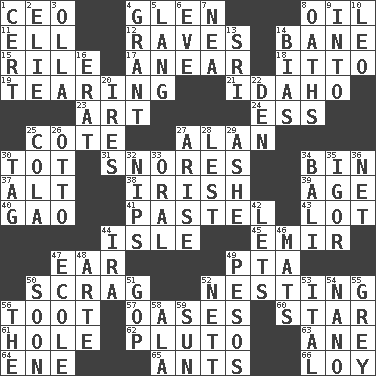 ACROSS 1. Corporate head (abbr.) 4. Small, secluded valley 8. Lubricate 11. Pipe bend 12. All-night dance parties 14. Object of repulsion 15. Cause heat under the collar 17. Approach 18. "Tell ____ the Marines!" 19. Lacerating 21. Potato state 23. Nonscientific branch of learning 24. Curvy letter 25. ____ d'Azur (French Riviera) 27. ____ Jay Lerner 30. Small child 31. Sounds asleep 34. Storage container 37. Keyboard modifier key 38. From or relating to Ireland 39. Mature 40. E Mali city 41. Soft color 43. Car dealer's back yard 44. Capri or Wright 45. Independent ruler or chieftain 47. Hearing organ 49. Parent Teacher Association (abbr.) 50. Lean end of the neck 52. Snuggling 56. A blast of a horn 57. Fertile tracts in a desert 60. Play the lead 61. Hollow 62. Mickey's pet 63. One (Scot) 64. Compass dir. 65. Pismires 66. Myrna of the movies DOWN 1. Sure thing 2. Writer Wiesel 3. Spanish pot 4. Monetary aid 5. Austrian-born American filmmaker Fritz 6. Night before a holiday 7. Teachers' org. 8. Curses 9. To the inside or interior of 10. Lion 13. _ Lanka 14. Prejudice 16. Part of Q.E.F. 20. Angers 22. Lair 25. Root beer relative 26. Von Bismarck 27. Originate 28. For fear that 29. American tennis player Robert 30. Label 32. Pinches, bites 33. Relating to the mouth 34. Indonesian resort city 35. Composer Stravinsky 36. Fish or hair follower 42. Allows 44. Lyricist Gershwin 46. Floor protectors 47. Learning spot: Fr. 48. Johnson of "Laugh-In" 49. Mexican monetary units 50. Within a short period 51. Grand Old Party 52. Remaining after all deductions 53. Slanted text style (abbr.) 54. Billionth: prefix 55. Jennifer or Joel 56. Definite Article 58. Wing 59. Player for Phoenix