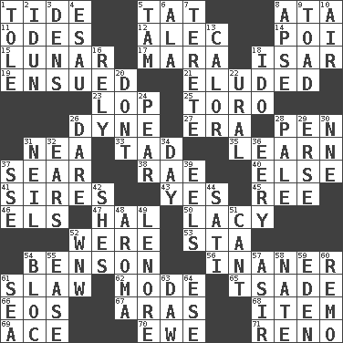 ACROSS 1. Event that recurs at intervals 5. Make lace 8. _ moment's notice (2 wds.) 11. Lyric poems 12. Actor Baldwin 14. Luau course 15. Type of eclipse 17. Hindu Mythology: god of death 18. Austrian river, tributary to the Danube 19. Took place subsequently 21. Dodged 23. Chop off 25. "Corrida" creature 26. Centimeter-gram-second unit of force 27. Period 28. Animal enclosure 31. Teachers' org. 33. Small boy 35. Acquire or gain knowledge or skills 37. Burn superficially 38. Actress Charlotte 40. Otherwise 41. Fathers 43. It is so 45. To separate or throw off 46. Raised railways 47. Actor Linden 50. Made of lace 52. We are 53. R.R. building 54. Gillaume's butler role 56. Sillier 61. Cole _ (cabbage dish) 62. Method 65. Sadhe (variant) 66. Greek goddess of the dawn 67. Ancient river in northeast Turkey 68. Detail 69. Adept person 70. She-sheep 71. Former U.S. Attorney General Janet DOWN 1. Lacquered or enameled metalware 2. Goddess of spring and wife of Bragi 3. Lairs 4. Son of Isaac 5. Scottish cap 6. Chicken ___ king 7. Cigar-shaped 8. Domed church section 9. Frog relative 10. Atmosphere 13. Bodily heat indicating an inflammation 16. Have trust in 18. Wedding promise 20. Do not 22. Mountain range 24. Lightbulb-shaped fruit 26. Have the gumption 28. Diluted with white 29. Celtic language 30. Compass dir. 31. Famous astronaut Armstrong 32. Hearing organs 34. 24 hours 36. Suggestive of the supernatural 37. Compass dir. 39. Snakelike fish 42. "______ My Girl" (Turtles hit) 44. Suttee (variant) 48. Odor 49. Poe poem 51. Patter 52. Compass dir. 54. Alliance 55. Relaxation 57. SW Saudi Arabia district 58. Nathan's nickname 59. Locale of original sin 60. San ____ (Riviera town) 61. Ocean 63. Fool 64. Compass dir.