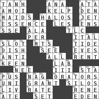 ACROSS 1. Hyperbolic tangent 5. Santa ___, CA 8. _ moment's notice (2 wds.) 11. Mine, in Marseilles 12. Seaweed 14. Lair 15. Unmarried girls 17. Auras 18. Type of plane 19. Center 21. French article 22. Followers of ems 23. Compass dir. 24. In the manner of 25. Affectionate concern, for short 27. For each 28. Slanted text style (abbr.) 31. Position in a hierarchy or organization 35. Mountains (abbr.) 37. Event that recurs at intervals 38. Food container 39. Observe 41. Nights before holidays 42. Against 43. 100% 45. Monthly bill 46. Peachy ____! 47. Experiment locale 49. Born 51. One more than two 52. R.R. building 55. Suppuration 57. Tired old horse 60. Speakers 62. Corn or form start 63. Monetary aid 65. Grain storage towers 66. 54 in ancient Rome 67. Assign a rank or rating to 68. French philosopher Descartes 69. Had dinner 70. Arrange properly for use 71. Paradise DOWN 1. Makes less strong or intense 2. Collect or gather 3. Annoying sound 4. Flintstone garb 5. Alias (abbr.) 6. 1994 drama film starring Jodie Foster 7. Medicinal plant 8. Descriptive word 9. Adolescent 10. Pismires 13. Inconspicuous attention getter 16. Fastener 17. Centers of feelings and intuitions 20. To starve (Brit.) 26. 61 cubic inches 29. An important port of Yemen 30. For fear that 31. Neighbor of Neb. 32. Actor's bit 33. Clearly or manifestly demonstrative 34. One or ones belonging to thee 36. Ocean 40. American author Paul (1891-1958) 44. Den 48. Prejudice 50. Engineer (abbr.) 52. Having a sole or soles 53. Heavy duty weighing machine 54. NE Netherlands city 55. Monetary unit of Botswana 56. A single undivided whole 58. Caspian sea tributary 59. Yard entry 61. Become fatigued 64. Fish or hair follower