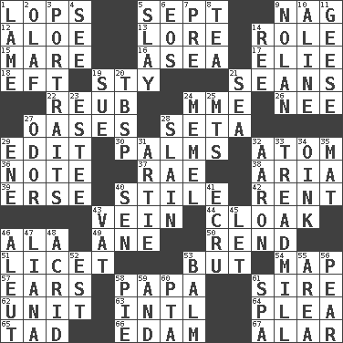 ACROSS 1. Chops off 5. Back-to-school mo. 9. Tired old horse 12. Medicinal plant 13. Old wives' tales, e.g. 14. Hero or heavy, e.g. 15. Female horse 16. Toward the sea 17. Writer Wiesel 18. Newt 19. Filthy place 21. Actors Connery and Penn 22. Reuben's nickname 24. Madame (abbr.) 26. Born 27. Fertile tracts in a desert 28. Stalk of a moss capsule 29. Prepare for publication 30. Insides of hands 32. Smallest unit of an element 36. Musical sound 37. Actress Charlotte 38. Operatic vocal solo 39. Celtic language 40. Vertical member of a panel or frame 42. Monthly bill 43. Distinctive style or manner 44. Covering 46. Wing 49. One (Scot) 50. Tear apart 51. It is permitted: Lat. 53. On the contrary 54. Atlas unit 57. Hearing organs 58. Dad 61. Male parent of an animal 62. A single undivided whole 63. International (abbr.) 64. Entreaty 65. Bit 66. Dutch treat 67. Having or resembling wings DOWN 1. Unable to walk 2. Norwegian king 3. Likenesses of persons 4. Observe 5. Kill 6. Greek goddess of the dawn 7. Before (prefix) 8. Afternoon social gathering 9. Pitcher Ryan 10. Place in a line 11. Honkers 14. Portuguese money of account (variant) 19. Institute legal proceedings 20. Cook's measure (abbr.) 21. Ocean 23. First name in cosmetics 24. Klaipeda city 25. Mountains (abbr.) 27. Scent 28. Killed 29. Compass dir. 31. Nick name for Arthur 32. Composer Copland 33. Excercise machine 34. Pig sound 35. Floor protector 40. Elected rep. 41. Shade of tan 43. Large container 45. Allow 46. Eskimo relative 47. Woody, climbing, usually tropical plant 48. Bitter 52. Eastern Standard Time (abbr.) 53. Lip ointment 55. Type of rug 56. Lightbulb-shaped fruit 58. Sliced dessert 59. Also 60. Parent Teacher Association (abbr.) 61. Health resort