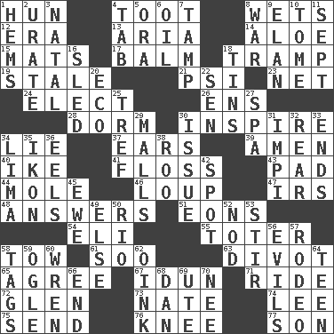 ACROSS 1. Attila the _ 4. A blast of a horn 8. Moistens 12. Period 13. Roberta Peters solo 14. _ vera 15. Floor protectors 17. Lip ointment 18. _____ steamer (cargo ship) 19. Lacking originality or spontaneity 21. Air pressure measure (abbr.) 23. Fish or hair follower 24. Voters do this 26. Followers of ems 28. Dormintory (informal) 30. Motivate 34. Whopper 37. Hearing organs 39. So be it 40. Eisenhower's nickname 41. Soft thread for cleaning between teeth 43. Writing tablet 44. Undercover agent 46. Central Nebraska county 47. Big collection agency 48. Statements in reply to questions 51. Immeasurably long periods of time 54. Biblical high priest 55. Carrier 58. Pull behind 61. "Barney Miller" actor Jack 63. A piece of turf (Scot.) 65. Match 67. Goddess of spring and wife of Bragi 71. Travel on an animal 72. Small, secluded valley 73. Nathan's nickname 74. Area sheltered from the wind 75. Transmit 76. Leg joint 77. Manchild DOWN 1. Equivocates 2. A salt of uric acid 3. Relating to or accompanying birth 4. Keyboard key 5. Mouth or opening 6. Lubricate 7. Pack (down) 8. Armed conflict 9. Style 10. Heavy book 11. Back-to-school mo. 16. Downhill vehicle 18. Canisters 20. Environmental prefix 22. Elected rep. 25. Unclean, religiously 27. Health resort 29. Promenades 30. Come out of 31. Body of Kaffir warriors 32. Tail end 33. Extremities 34. Pale green bean 35. Picture 36. Snakelike fish 38. Friend of Pooh 42. Blemish 45. She-sheep 49. Otherwise 50. _ de Janeiro 52. Allow head to fall sleepily 53. Disorderly outburst 56. Vices 57. Cowboy competition 58. Labels 59. Stare 60. Songbird 62. Pig sound 64. Adolescent 66. Conclusion 68. One of the 12 tribes of Israel 69. Shoshoni 70. Born