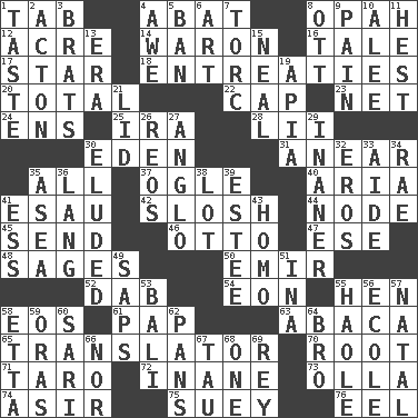 ACROSS 1. Keyboard key 4. Blind as ____ 8. Brightly colored fish 12. 1/640 square mile 14. Make _____ (do battle with) 16. Falsehood 17. Play the lead 18. Pleas 20. Add up to 22. Head covering 23. Fish or hair follower 24. Followers of ems 25. Retirement account (abbr.) 28. Cards in a Roman deck? 30. Genesis locale 31. Approach 35. 100% 37. Stare at amorously 40. Roberta Peters solo 41. Son of Isaac 42. Agitate, as a liquid 44. Connecting point 45. Post 46. Von Bismarck 47. Compass dir. 48. Gurus 50. Independent ruler or chieftain 52. Small moist lump or mass 54. Period of immesurable duration 55. Layer 58. Greek goddess of the dawn 61. Infant food 63. Phillipine bananalike plant 65. Interpreter 70. Carrot, for example 71. Pacific island yam 72. Lacking in sense or substance 73. Rounded earthenware pot or jar 74. SW Saudi Arabia district 75. Chop _ 76. Snakelike fish DOWN 1. Clothes sense 2. Gambison 3. Naughty children 4. Deep reverence 5. Prohibit 6. Tate display 7. Torque (variant) 8. Baseball player Mel 9. Ache 10. Toward shelter 11. Command 13. Epoch 15. Anneal 19. Capital of Western Samoa 21. Hat (slang) 26. Vintage cars 27. White American of non-Hispanic descent 29. Sillier 30. Dodged 32. Greek god of love 33. Helper 34. Actress Charlotte 35. Toward the sea 36. Austrian-born American filmmaker Fritz 38. Car dealer's back yard 39. First name in cosmetics 41. Double-curved letter 43. Same (prefix) 49. Plant excrements 51. _ tizzy (2 wds.) 53. Indonesian resort city 55. White Person, in Hawaii 56. Learning spot: Fr. 57. Relating to or accompanying birth 58. Singer James 59. Mouths or openings 60. Indian skirt 62. Baking dishes 64. Sis' sibling 66. Not either 67. The 19th letter of the Greek alphabet 68. Single 69. Marina Del _, California