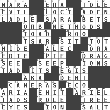 ACROSS 1. Hindu Mythology: god of death 5. Epoch 8. Lacquered or enameled metalware 12. Morally bad or wrong 13. Venues 15. An important port of Yemen 16. Dipping utensil 18. "Two Mules for Sister ____" 19. Stakes 20. Globe 22. Modes 24. Frog relative 26. Friend of Pooh 27. Russian ruler of old 28. Be seated 29. Small child 32. Flintstone garb 35. Actor Baldwin 37. Mouth or opening 38. Singer Brickell 39. Sliced dessert 40. To be drawn or hauled along 41. Perceive with the eye 42. Ooze 43. Charged atoms 44. Small amount or degree 45. ___ a Wonderful Life 46. The front part of a cuirass 49. Alias (abbr.) 50. Incision 51. Devices for capturing images 55. Environmental prefix 56. Roberta Peters solo 57. Send forth 59. Satellite of Uranus 63. Bits 64. Hero or heavy, e.g. 65. Family _ (genealogy) 66. Sight organs 67. Electrically charged atom 68. Table seasoning DOWN 1. Cartoonist voice _ Blanc 2. Actress Gardner 3. To free from 4. One to whom something is allotted 5. Raised railways 6. Wander aimlessly 7. 1/640 square mile 8. Off limits 9. Wrote a lyric poem 10. Allows 11. Followers of ems 14. Of or pertaining to medicine 17. Greek god of love 21. Sound made by sheep 23. Being at a high temperature 25. Window treatments 28. Oozed 29. "Corrida" creature 30. NW Algerian seaport 31. Labels 32. Command 33. The content of cognition 34. Passed on 36. Untruth 40. What propaganda does 42. A viewer who gazes fixedly 45. Mamie's husband 47. Turn to the right 48. South American Indian 49. Collect or gather 51. Supercomputer manufacturer 52. Helper 53. Mine, in Marseilles 54. Grain storage tower 56. Had dinner 58. "___ Little Indians" 60. Retirement account (abbr.) 61. Snakelike fish 62. Allow