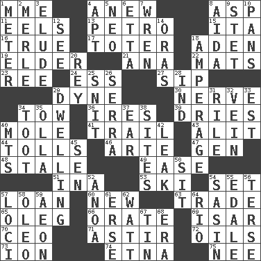 ACROSS 1. Madame (abbr.) 4. Afresh 8. Viper 11. Snakelike fish 13. Stone: prefix 15. Call ___ day 16. Loyal 17. Carrier 18. Arabian gulf 19. A person who is older than you are 21. Santa ___, CA 22. Floor protectors 23. To sift 24. Double-curved letter 27. Small drink 29. Centimeter-gram-second unit of force 30. Boldness 34. Pull behind 36. Angers 39. Frees from moisture 40. Undercover agent 41. Drop behind 43. Came down and settled, as after flight 44. For Whom the Bell _____ 46. Johnson of "Laugh-In" 47. Commissioned mil. rank 48. Showing deterioration from age 49. Comfort 51. _ tizzy (2 wds.) 53. What Jean-Claude Killy likes to do 54. Arrange properly for use 57. Grant temporary use of 60. ___ Haven, CT 63. Buy and sell 65. Cassini of fashion 66. Declaim 69. Austrian river, tributary to the Danube 70. Corporate head (abbr.) 71. Being in motion 72. Lubricates 73. Electrically charged atom 74. Inactive volcano in Sicily 75. Born DOWN 1. Distance measurement 2. Haggard of country music 3. Dodge 4. Fitting 5. Modern: prefix 6. Singer James 7. Songbird 8. Opera by Verdi 9. Proofreading order 10. Zero-star reviews 12. Perceive with the eye 14. Mouths or openings 18. Electrical Measurement 20. Marina Del _, California 25. In a ____ (agitated or irritated) 26. Spanish missionary in California 28. Working for oneself (abbr.) 29. Residence 31. Cause heat under the collar 32. Distinctive style or manner 33. Eastern Standard Time (abbr.) 34. A blast of a horn 35. Rounded earthenware pot or jar 37. Hearing organ 38. Settings 40. Mountains (abbr.) 42. Path through which fluid escapes 45. Elected rep. 50. Be seated 52. Small Philippine buffalo 54. Indian antelope 55. Peak District village in England 56. Laconic 57. Venues 58. Margarine 59. A really long time 61. Celtic language 62. Electrical Unit 64. _ de Janeiro 67. Metal container 68. Epoch
