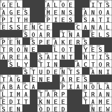 ACROSS 1. Set 4. Medicinal plant 8. ___ a Wonderful Life 11. Matures 13. Not women's 14. Small Philippine buffalo 15. Heart or essence 16. Sliced desserts 17. Suttee (variant) 18. Gist 21. Lessep's creation 22. Fly high 23. _ tizzy (2 wds.) 25. Raised railways 26. Writing instrument 29. Orators 32. Marketplace scale 34. Car dealer's back yard 35. It is so 38. Type of rug 39. Virtuous person 41. Nuclear Threat Initiatives 43. Wily 44. Shallow baking pan 45. Thespian 46. SAT takers 50. Cuckoo 51. Label 54. Compass dir. 55. Ancient Greek god of war 57. Phillipine bananalike plant 59. Player piano 63. Pale green bean 64. Canvas cover 67. SW Asia republic 68. Prepare for publication 69. Leg joint 70. Not wild 71. Elected rep. 72. Wrote a lyric poem 73. ___ Haven, CT DOWN 1. Open wide 2. Armor plate that protects the chest 3. Allows 4. Electrical Unit 5. Flowery wreath 6. Single 7. Curvy letter 8. Silly 9. "_____ Recall" 10. Travel by water 12. "______ My Girl" (Turtles hit) 14. White ___ sheet 19. Characteristic smell of wine 20. Head covering 21. Auto 23. Image 24. Remaining after all deductions 26. Parent Teacher Association (abbr.) 27. Blunders 28. Christmas carol 30. Place in a line 31. Synchronize (abbr.) 33. Negative votes 36. Singer James 37. The Jewish people; Israel 39. Astound 40. Helper 42. _ Lanka 45. At sea 47. Beverage made from leaves 48. Slept 49. Three (prefix) 51. Lies 52. Stay 53. Street urchin 56. In a ____ (agitated or irritated) 58. Domesticated feline 60. NW Algerian seaport 61. Unable to walk 62. Afresh 64. Ring climax 65. Plus 66. To riddle