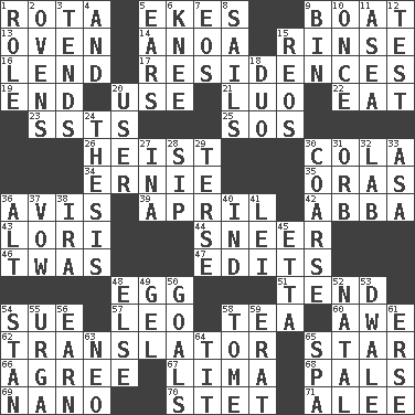 ACROSS 1. Roll call or roster of names 5. Makes supply last 9. Water vessel 13. Baking chamber 14. Small Philippine buffalo 15. Remove soap 16. Grant temporary use of 17. Homes 19. Conclusion 20. Purpose 21. Nilotic language 22. Ingest 23. Fast planes 25. Mayday 26. Robbery 30. Root beer relative 34. Bert's buddy 35. Mouths or openings 36. Deliberation 39. Showery time 42. Swedish rock group 43. Australian parrot (variant) 44. Contemptuous expression 46. It was, poetically 47. Proofreads 48. Ovum 51. Be inclined (to) 54. Take to court 57. Lion 58. Beverage made from leaves 60. Deep reverence 62. Interpreter 65. Play the lead 66. Match 67. Pale green bean 68. Friends 69. Billionth: prefix 70. Proofreading order 71. Toward shelter DOWN 1. Hero or heavy, e.g. 2. Baking chambers 3. Is inclined (to) 4. Plus 5. Hearing organs 6. Leg joint 7. Greek goddess of the dawn 8. Moves on water 9. Storage container 10. At one time in the past 11. At sea 12. Trial 15. Vintage cars 18. Superhero pair 20. One who uses or employs something 24. College paper 27. _ tizzy (2 wds.) 28. Small drink 29. Laconic 30. Rough 31. Globe 32. Experiment locale 33. White ___ sheet 36. Keyboard modifier key 37. Promise 38. Lyricist Gershwin 40. Indiana (abbr.) 41. Luau accessory 45. Singer James 48. Otherwise 49. Set 50. Scores awarded for successful feats 52. Brizilian seaport 53. A sleeping potion; an opiate (poet.) 54. Comedian Laurel of Laurel & Hardy 55. Capital and largest city of Mongolia 56. Merit 58. Heavy book 59. Part of Q.E.F. 61. Celtic language 63. Modern: prefix 64. Teat (slang) 65. Health resort
