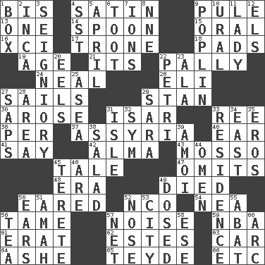 ACROSS 1. Again 4. Smooth fabric 9. Whine 13. Single 14. Soup utensil 15. Spoken 16. One more than ninety 17. Heavy duty weighing machine 18. Groovy apts. 19. Personal question 21. It is 22. Friendly 24. Actress Patricia 26. Biblical high priest 27. Moves on water 29. Comedian Laurel of Laurel & Hardy 30. Came up 31. Austrian river, tributary to the Danube 33. Portuguese money of account (variant) 36. For each 37. Nineveh was its capital 40. Ewer handle 41. Declare 42. _ mater 43. With motion or animation 45. Lie 47. Leaves out 48. Epoch 49. Passed on 50. Having ears or earlike features 52. Non-commissioned officer (abbr.) 54. Teachers' org. 56. Docile 57. Annoying sound 59. Basketball assoc. 61. Part of Q.E.F. 62. _____ Park, CO 63. 4-wheeled motor vehicle 64. American tennis player Robert 65. Miss Universe 1986, Barbara Palacios _ 66. And so on (abbr.) DOWN 1. Gift holder 2. South American Indian 3. Signiory (variant) 4. Fast jet (abbr.) 5. Showery time 6. A blast of a horn 7. Charged atoms 8. Compass dir. 9. Cotton for raincoats, e.g. 10. Mountain range 11. Kenny Rogers chart-topper in '80 12. Raised railways 20. Snakelike fish 22. _ dish (used to culture cells) 23. In the manner of 25. Toward the sea 27. Plant excrements 28. Type of rug 29. "Two Mules for Sister ____" 31. Small island 32. Symbol (abbr.) 33. Dwelling 34. Compass direction 35. Greek god of love 38. Vegetable dish 39. Mine, in Marseilles 44. Sign of something about to happen 45. Cylindrical with tapered ends 46. "We ___ not amused" (Victoria) 49. Administered medicine 50. Hearing organs 51. Housemaid 52. Olfactory organ 53. Municipality 55. Blind as ____ 56. Beverage made from leaves 57. Fish or hair follower 58. Compass dir. 60. Curve