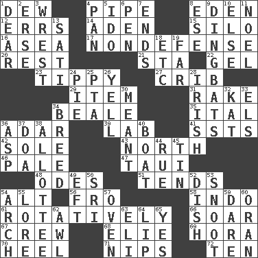 ACROSS 1. Morning condensation 4. Corncob 8. Paradise 12. Blunders 14. An important port of Yemen 15. Grain storage tower 16. Toward the sea 17. Unrelated to defense, as in spending 20. Respite 21. R.R. building 22. Set 23. Likely to tip or tilt 27. Baby bed with high sides 29. A whole individual unit 31. Libertine 34. Memphis, Tenn. Street 35. Slanted text style (abbr.) 36. The sixth month of the Jewish calendar 39. Experiment locale 41. Fast planes 42. Flatfish 43. Compass direction 46. Light colored 47. "Change" in Tahitian 48. Lyric poems 51. Looks after 54. Keyboard modifier key 56. Back 58. _ china 61. Rotating or pertaining to rotation 66. Fly high 67. Ship's personnel 68. Writer Wiesel 69. Israeli folk dance 70. Person who is morally reprehensible 71. Cuts off 72. Nine, plus one DOWN 1. Letter starter 2. Celtic language 3. Take or capture by force 4. Baking dish 5. Wedding promise 6. Animal enclosure 7. Extremities 8. Compass dir. 9. Empty-headed or silly people 10. Otherwise 11. Christmas carol 13. Suttee (variant) 18. And so on (abbr.) 19. Distant 24. Sliced dessert 25. Parent Teacher Association (abbr.) 26. Shout 28. From or relating to Ireland 30. Intended 32. Krazy ___ of comics 33. Raised railways 34. A special lineage 36. Cleo's killer 37. ___ good deed 38. One to whom something is allotted 40. Water vessel 44. Sorrow 45. Metal container 49. Newt 50. _ Lanka 52. Food container 53. Snout, nose 54. Bowlike part 55. Old wives' tales, e.g. 57. Baking chamber 59. Have the gumption 60. NW Algerian seaport 62. Leather borer 63. Connecticut Ivy Leaguer 64. Mouth edge 65. Consenting reply