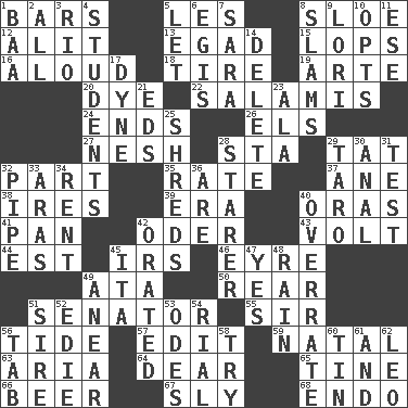 ACROSS 1. Taverns 5. French article 8. _ gin 12. Set down 13. Mild oath 15. Chops off 16. Verbally 18. Become fatigued 19. Johnson of "Laugh-In" 20. Color 22. Deli grouping 24. Extremities 26. Raised railways 27. Tender 28. R.R. building 29. Make lace 32. Component 35. Assign a rank or rating to 37. One (Scot) 38. Angers 39. Period 40. Mouths or openings 41. Baking dish 42. River in Europe 43. Electrical Unit 44. Eastern Standard Time (abbr.) 45. Big collection agency 46. Jane of fiction 49. "One Day ___ Time" 50. Stern 51. Elected representative 55. Title for a knight 56. Periodic rise and fall of the sea level 57. Prepare for publication 59. Brizilian seaport 63. Roberta Peters solo 64. Letter starter 65. Prong on a fork 66. Fermented drink made from hops 67. Mischievous 68. Inside; within (prefix) DOWN 1. Sound made by sheep 2. 100% 3. _ de Janeiro 4. SAT takers 5. Allow 6. Armor plate that protects the chest 7. "Two Mules for Sister ____" 8. Hits or strikes with great force 9. Australian parrot (variant) 10. Chooses 11. Compass dir. 14. Erase 17. Centimeter-gram-second unit of force 21. Begley and Asner 23. In the manner of 25. Fragments 28. A viewer who gazes fixedly 29. Pacific island yam 30. Of or related to the anus 31. Trial 32. Corncob 33. Ancient river in northeast Turkey 34. Monthly bill 36. "We ___ not amused" (Victoria) 40. Make much ado about nothing 42. Declaimed 45. Call ___ day 47. It is so 48. Water falling in drops from the sky 49. Approach 51. Beget 52. Singer Brickell 53. Lyric poems 54. Monetary unit of Yemen 56. Bar bill 58. Attempt 60. Metal container 61. Added to 62. Lion