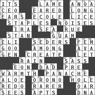 ACROSS 1. ___ a Wonderful Life 4. Unable to walk 8. Small Philippine buffalo 12. Corporate head (abbr.) 13. Having ears or earlike features 14. Having great length 15. Hearing organs 17. Learning spot: Fr. 18. Louse (plural) 19. Paper fasteners 21. Annoying sounds 23. Retirement account (abbr.) 24. Ocean 26. Sorrow 27. Comedian Laurel of Laurel & Hardy 28. Island territory of the United States 30. Biblical high priest 31. Spring feasts 34. Opposite of masc. 37. Thick or sticky substance 38. Amid 39. Actress Gardner 40. Commissioned mil. rank 41. Make 42. Allow 43. Precipitation 44. Backtalk 46. Age 47. June honoree 50. Before (prefix) 51. Heat 54. Flamboyance 57. _ vera 58. U. of Maine site 60. Hollow 62. Redecorate 63. Less widely known 64. Rowing implement 65. Perceives with the eye 66. Tenement units (abbr.) 67. Heredity factor (abbr.) DOWN 1. Frozen water 2. Beverages made from leaves 3. Decision 4. Shoestrings 5. Came up 6. Cartoonist voice _ Blanc 7. Paradise 8. Plant genus of onion and garlic 9. Annoying sound 10. Single time 11. Ripens 13. Snakelike fish 16. "Two Mules for Sister ____" 20. Baking dish 22. Mouths or openings 25. Representative 27. A type of plum 29. Goad 30. Oval reproductive body of a fowl 31. Indian skirt 32. Make improvements or corrections to 33. ___ good deed 34. It jiggles the polygraph 35. Nights before holidays 36. Floor protector 41. Patter 43. Lover boys 44. Health resort 45. Bowlike part 46. Wear away 48. To the left, to Queeg 49. Natives or inhabitants of Denmark 51. Armed conflicts 52. Toward shelter 53. Israeli folk dance 55. Or not 56. Flair 59. Hit sharply and swiftly 61. Period