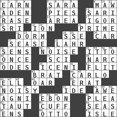ACROSS 1. Merit 5. "Two Mules for Sister ____" 9. Opening into something insatiable 12. Arabian gulf 13. Sliced desserts 14. Indian skirt 15. Raze (variant) 16. Type of rug 17. Composer Stravinsky 18. _ Lanka 19. Electrically charged atom 21. A-one 22. Dormintory (informal) 24. Compass dir. 26. Automobile 27. Gospel singer Marvin 28. Cowardly lion portrayer 29. Elected reps. 30. Annoying sound 32. "Tell ____ the Marines!" 36. Single time 37. _-fi 38. Drug cop 39. Lyric poems 40. Ancient Celtic tribe of eastern Britain 42. Sudden quick movement 43. Naughty child 44. Monte _, Las Vegas Hotel/Casino 46. Pipe bend 49. Rowing implement 50. Part of Q.E.F. 51. Annoyingly loud 53. Binary compound 54. Deep reverence 57. Hindu god of fire 58. Inky black, to poets 61. Entreaty 62. Strained 63. Sleeve end 64. Oceans 65. Followers of ems 66. Von Bismarck 67. Small island DOWN 1. Hearing organs 2. The sixth month of the Jewish calendar 3. Dwelling 4. Compass dir. 5. Connect, as a bridge 6. Wind 7. To riddle 8. White ___ sheet 9. Mysterious quality of enchantment 10. Odor 11. One who wires 14. Title for a knight 19. Big collection agency 20. Sign of something about to happen 21. For each 23. Fertile tracts in a desert 24. Indian antelope 25. A female animal or person 27. Transmit 28. It is permitted: Lat. 29. "Barney Miller" actor Jack 31. Motion picture award 32. Kind of red light 33. Baron Munchausen's specialties 34. Musical group of three 35. Sep. follower 40. Retirement account (abbr.) 41. On the rocks 43. Male child 45. "We ___ not amused" (Victoria) 46. Maternal 47. Utah city north of Ogden 48. "_ and Lucy" (Charlie Brown theme song) 52. Be seated 53. Information 55. Welt 56. Relaxation 58. Environmental prefix 59. On the contrary 60. Often (poetically) 61. Air pressure measure (abbr.)