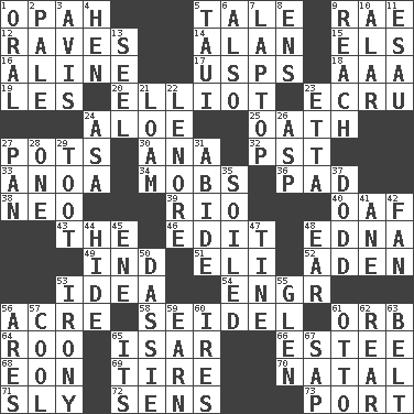 ACROSS 1. Brightly colored fish 5. Story 9. Actress Charlotte 12. All-night dance parties 14. ____ Jay Lerner 15. Raised railways 16. Place in a line 17. United States Postal Service (abbr.) 18. American Automobile Association (abbr.) 19. French article 20. American author Paul (1891-1958) 23. Shade of tan 24. Medicinal plant 25. Pledge 27. Plant holders 30. Santa ___, CA 32. Pacific Standard Time (abbr.) 33. Small Philippine buffalo 34. Disorderly crowds 36. Groovy apt. 38. Modern: prefix 39. River (Sp.) 40. Clumsy lout 43. Definite Article 46. Prepare for publication 48. Pulitzer Prize-winning author Ferber 49. Indiana (abbr.) 51. Biblical high priest 52. An important port of Yemen 53. The content of cognition 54. Engineer (abbr.) 56. 43,560 square feet 58. A glass for beer 61. Globe 64. Friend of Pooh 65. Austrian river, tributary to the Danube 66. First name in cosmetics 68. Age 69. Become fatigued 70. Brizilian seaport 71. Secret 72. Elected reps. 73. Left side of a ship or aircraft DOWN 1. Relating to the mouth 2. Diluted with white 3. Deliberation 4. Layer 5. "Change" in Tahitian 6. In addition 7. Portable computer 8. Followers of ems 9. Arrive at 10. Having or resembling wings 11. He sold his birthright 13. Sew up the eyelids of hawks and falcons 21. Rich soil 22. Poe poem 23. Singer James 24. White ___ sheet 26. Viper 27. Baking dish 28. Single 29. A blast of a horn 31. Tolerate 35. Dirtied 37. Texas town _ City 41. One (Scot) 42. Air blower 44. Flintstone garb 45. Compass dir. 47. Prong on a fork 48. Hearing organ 50. Small ungulate mammals of Africa 53. Literary sarcasm 55. Small, secluded valley 56. Ancient Greek god of war 57. Calm and collected 59. Merit 60. Angers 61. Von Bismarck 62. Stern 63. Waist strap 65. ___ a Wonderful Life 67. Plant excrement