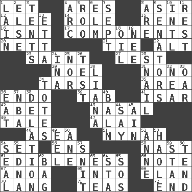 ACROSS 1. Allow 4. Ancient Greek god of war 8. SW Saudi Arabia district 12. Toward shelter 14. Hero or heavy, e.g. 15. French philosopher Descartes 16. Is not 17. Pieces 20. Remaining after all deductions 21. Standoff 22. The first octave above the treble staff 23. Virtuous person 27. For fear that 29. Christmas carol 31. Words to Nanette 34. Tarsus (plural) 35. Type of rug 36. Inside; within (prefix) 39. Bar bill 41. Austrian river, tributary to the Danube 42. Collude with 43. Rhinal 46. Falsehood 47. Jai _ 48. At sea 51. Non-adult bird? 54. Arrange properly for use 56. Followers of ems 58. Political cartoonist Thomas 61. The property of being fit to eat 66. Brief written record 67. Small Philippine buffalo 68. To the inside or interior of 69. Flair 70. Long (Scottish) 71. Afternoon social gatherings 72. Conclusion DOWN 1. (Had) reclined 2. Otherwise 3. Portable shelters 4. Curve 5. Friend of Pooh 6. Shade tree 7. Back-to-school mo. 8. "We ___ not amused" (Victoria) 9. Elected representatives 10. International (abbr.) 11. Take ten 13. Singer James 18. Lubricate 19. Born 24. _ tizzy (2 wds.) 25. And not 26. Trial 28. Slow-paced one 30. Climbing, woody, usually tropical vines 32. Teachers' org. 33. Rowing implement 34. Hauls 36. Consume 37. Basketball assoc. 38. Accusation by an informer 40. Lip ointment 44. Declare 45. The 18th letter of the Arabic alphabet 49. Snakelike fish 50. One (Scot) 52. Singer Murray 53. White Person, in Hawaii 54. Lick closed 55. Pulitzer Prize-winning author Ferber 57. In a ____ (agitated or irritated) 59. Comedian Laurel of Laurel & Hardy 60. Watch over 62. Container for groceries 63. Compass dir. 64. R.R. building 65. Mayday