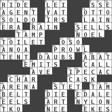 ACROSS 1. Travel on or in a vehicle 5. Flowery wreath 8. Compass dir. 11. Representative 13. Large container 14. Von Bismarck 15. Twentieth part of a lira 16. Big collection agency 17. (Had) reclined 18. Epoch 19. Precipitation 21. Makes a sale 22. Pack (down) 24. Christmas carol 25. Bathroom 27. Bear (Spanish) 29. Small Philippine buffalo 30. Move like a hungry wolf 32. Portable shelter 33. Applies to a surface 35. Blind as ____ 39. Gives off 41. Give a ring to 42. "___ Maria" 43. Medicinal drug used to evoke vomiting 45. Burn to charcoal 48. Keg 49. Sports stadium 50. Proofreading order 52. Scottish cap 55. Waist strap 56. Pass on 57. Peak District village in England 59. Snakelike fish 60. Tate display 61. High-strength synthetic material 62. Ring climax 63. Born 64. Makes supply last DOWN 1. Raze (variant) 2. Composer Stravinsky 3. Accusation by an informer 4. Conclude 5. 57 in ancient Rome 6. Merit 7. It is 8. Lacking originality or spontaneity 9. Free from disturbance or agitation 10. Immeasurably long periods of time 12. Singer Mel 14. Margarine 20. Fitting 21. Frozen precipitation 23. Having winglike extensions 25. Make lace 26. Single 27. Globe 28. Distress signal 30. Tenth month of the Hindu calendar 31. Shoestrings 33. HTML Container Element 34. Had dinner 36. Sass 37. Chicken ___ king 38. Affectionate concern, for short 40. Hindu Mythology: god of death 43. Frozen water 44. Eucharist need 45. Small stream 46. Phone greeting 47. Pismires 49. Collude with 50. Male parent of an animal 51. Wig 53. Medicinal plant 54. Not women's 56. Daniel's nick name 58. Color