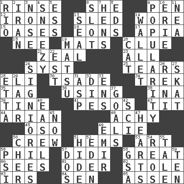 ACROSS 1. Wash lightly 6. A female animal or person 9. Fenced enclosure 12. Removes the wrinkles 13. Downhill vehicle 14. Had on 15. Fertile tracts in a desert 16. Immeasurably long periods of time 17. Capital of Western Samoa 18. Born 19. Floor coverings 20. A slight indication 21. Ardor 23. Everything 24. System (abbr.) 25. Rends 28. Biblical high priest 30. Sadhe (variant) 34. Long journey 35. Label 36. Exploiting 38. _ tizzy (2 wds.) 39. Prong on a fork 41. Mexican monetary units 43. Teat (slang) 44. Believer in; advocate of (suffix) 46. Painful 48. Bear (Spanish) 49. Writer Wiesel 50. Ship's personnel 51. Folds over and sews together 53. Nonscientific branch of learning 56. Silvers or Donahue 57. "You Light Up My Life" star Conn 58. Relatively large 60. Observes 61. Baltic tributary 62. Took without asking 63. Big collection agency 64. Elected rep. 65. NE Netherlands city DOWN 1. River (Sp.) 2. SW Asia republic 3. Characteristic smell of wine 4. Dwarf with a sinus problem 5. Double-curved letter 6. Slit 7. Coop moms 8. Begley and Asner 9. Teen's desire 10. 4th largest of the Great Lakes 11. Teachers' org. 13. Lick closed 14. Place for singles 19. Taiwanese island in East China Sea 20. Domesticated feline 22. Eastern Standard Time (abbr.) 24. Seigniories (variant) 26. Painter Guido (1575-1642) 27. Three-handed card game 28. Singer James 29. Den 31. Cleo's killer 32. Pass on 33. Followers of ems 37. Finish lines 40. Artist's stands 42. _-fi 45. Immediately 47. Centers of feelings and intuitions 49. Arab leader 50. "Mermaids" star 51. Flintstone garb 52. Genesis locale 54. Vintage cars 55. Falsehood 56. Air pressure measure (abbr.) 57. Two (Sp.) 58. Girls' org. (abbr.) 59. "___ Little Indians"