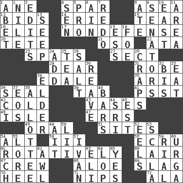 ACROSS 1. One (Scot) 4. Practice fight 8. At sea 12. Auction offers 14. One of the Great Lakes 15. Lacerate 16. Writer Wiesel 17. Unrelated to defense, as in spending 20. False hair 21. Bear (Spanish) 22. _ moment's notice (2 wds.) 23. Arguments over trivial matters 27. Religious group 29. Letter starter 31. Loose flowing garment 34. Peak District village in England 35. Roberta Peters solo 36. Lick closed 39. Keyboard key 41. Inconspicuous attention getter 42. Having a low temperature 43. Flower holders 46. Small island 47. Blunders 48. Spoken 51. Settings 54. The first octave above the treble staff 56. One more than two 58. Shade of tan 61. Happening in regular succession 66. Den 67. Group working together 68. _ vera 69. Volcanic refuse 70. Person who is morally reprehensible 71. Pinches, bites 72. In the manner of DOWN 1. Collude with 2. "Death on the ____" 3. Prepares for publication 4. Elected rep. 5. Adept person 6. The 18th letter of the Arabic alphabet 7. Make new 8. Had dinner 9. Legislators 10. 90 degrees 11. Length times width 13. Ooze 18. Curvy letter 19. Enemy 24. Increase 25. Afternoon social gathering 26. Table seasoning 28. Dice game 30. Break or tear apart 32. Again 33. Consume 34. A person who is older than you are 36. _-fi 37. Greek goddess of the dawn 38. One to whom something is allotted 40. Oblong pieces of solid material 44. Indian title of respect (Mr.) 45. Eastern Standard Time (abbr.) 49. Small island 50. Cards in a Roman deck? 52. Snakelike fish 53. Any of the three canals of the cochlea 54. Bowlike part 55. Old wives' tales, e.g. 57. _ the terrible 59. Monetary unit of Yemen 60. Capital and largest city of Mongolia 62. Leather borer 63. Biblical high priest 64. Chop off 65. Affirmative reply