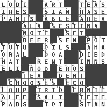 ACROSS 1. Farming town in central California 5. Nonscientific branch of learning 8. Afternoon social gatherings 12. Angers 13. Thailand, formerly 15. To erase 16. Leg coverings 18. Competent 19. Length times width 20. According to 22. French poetic form 24. Musical sound 26. Put into a specified state 27. Fermented drink made from hops 28. Elected rep. 29. Plant holder 32. Ballerina skirt 35. Lubricates 37. Nanny (var.) 38. Of the mouth 39. ___ good deed 40. Passed on 41. Floor protector 42. Monthly bill 43. Lodging establishments 44. Biblical high priest 45. Allow head to fall sleepily 46. Greek god of love 49. Beverage made from leaves 50. Incision 51. Opts 55. Environmental prefix 56. Central Nebraska county 57. Musical group of three 59. Bert's buddy 63. Toward shelter 64. Table seasoning 65. False hair 66. Groovy apts. 67. Small child 68. Comedian Laurel of Laurel & Hardy DOWN 1. Mouth edge 2. Mouth or opening 3. Lair 4. Byzantium, centuries later 5. White ___ sheet 6. Teases 7. Lie 8. Distinguishing feature 9. Merit 10. Toward the sea 11. Ocean 14. Makes clutter 17. A type of plum 21. Had dinner 23. Nine, plus one 25. Worn away 28. Scheduled 29. Ache 30. Sign of things to come 31. Small amounts or degrees 32. Heavy book 33. Mountain range 34. Jacques of French films 36. Electrically charged atom 40. What propaganda does 42. Exposes to great heat 45. Modern: prefix 47. To separate or throw off 48. At one time in the past 49. Drinks excessively 51. Root beer relative 52. Took on color 53. Part of Q.E.F. 54. Grain storage tower 56. Infant locale 58. Baseball player Mel 60. Fish or hair follower 61. Call ___ day 62. Car or cant ending