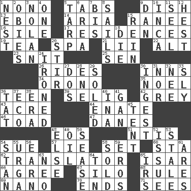 ACROSS 1. Words to Nanette 5. Bar bills 9. Food container 13. Inky black, to poets 14. Roberta Peters solo 15. Indian princess (variant) 16. Drop; flow; fall 17. Dwellings 19. Afternoon social gathering 20. Health resort 21. Cards in a Roman deck? 22. The first octave above the treble staff 23. In a ____ (agitated or irritated) 25. Elected rep. 26. Amusement-park features 30. Lodging establishments 34. U. of Maine site 35. Christmas carol 36. Adolescent 39. Former Milwaukee Brewers owner Bud 42. Jennifer or Joel 43. 43,560 square feet 44. Maternal 46. Frog relative 47. Natives or inhabitants of Denmark 48. Greek goddess of the dawn 51. Nuclear Threat Initiatives 54. Institute legal proceedings 57. Falsehood 58. Arrange properly for use 60. R.R. building 62. Interpreter 65. Austrian river, tributary to the Danube 66. Match 67. Grain storage tower 68. General guideline 69. Billionth: prefix 70. Conclusions 71. Observes DOWN 1. Egg locale 2. Off-Broadway awards 3. Pitcher Ryan 4. Single 5. Canvas cover 6. Length times width 7. Altar cloth linen 8. Travel by water 9. Daniel's nick name 10. South American Indian 11. Stitch closed the eyes of (a falcon) 12. Command 15. It's straight from the horse's mouth 18. Expire 20. Use a swizzle stick 24. Pressed 27. Two (Sp.) 28. Compass dir. 29. Having a sole or soles 30. Consume 31. Or not 32. Born 33. Cunning 36. Make lace 37. Environmental prefix 38. Epoch 40. _ tizzy (2 wds.) 41. Separate the seeds from cotton 45. Portable shelter 48. Otherwise 49. Petroleum 50. Gospel singer Marvin 52. Come out of 53. Lacking originality or spontaneity 54. Comedian Laurel of Laurel & Hardy 55. Capital and largest city of Mongolia 56. Merit 58. Disposed of to a purchaser 59. Greek god of love 61. Ancient Greek god of war 63. Modern: prefix 64. Metal container 65. Big collection agency