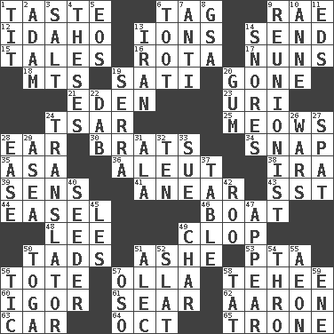 ACROSS 1. Clothes sense 6. Label 9. Actress Charlotte 12. Potato state 13. Charged atoms 14. Post 15. Stories 16. Round or rotation of duties 17. Religious women 18. Mountains (abbr.) 19. Suttee (variant) 20. Went 21. Locale of original sin 23. RI univ. 24. Russian ruler of old 25. Catcalls? 28. Hearing organ 30. Naughty children 34. Fastener 35. White ___ sheet 36. Native American of Southwest Alaska 38. Lyricist Gershwin 39. Elected reps. 41. Approach 43. Fast jet (abbr.) 44. Artist's stand 46. Water vessel 48. Area sheltered from the wind 49. Hoof sound 50. Bits 51. American tennis player Robert 53. Parent Teacher Association (abbr.) 56. Haul 57. Water jar 58. Giggle 60. Russian composer Stravinsky 61. Singe 62. Composer Copland 63. Automobile 64. Sep. follower 65. Marketplace scale DOWN 1. Teat (slang) 2. First man 3. Table seasoning 4. College papers 5. Greek goddess of the dawn 6. A blast of a horn 7. Against 8. Girls' org. (abbr.) 9. One who advocates reunion 10. Singer Murray 11. Begley and Asner 13. SW Asia republic 14. Sounds asleep 19. Father Junipero _ 20. Chewing product 22. Small moist lump or mass 24. Interpreter 26. Armed conflicts 27. Petty quarrel 28. Comfort 29. At sea 31. According to 32. "___ Little Indians" 33. Take to court 37. Eating place 40. Sowing specialist 42. Friend of Pooh 45. French article 47. Seem 49. Burn to charcoal 50. Ancient Roman robe 51. Actor Baldwin 52. Narrow board 54. Through, poetically 55. Age 56. Nervous spasm 57. Bear (Spanish) 58. Make lace 59. Compass dir.