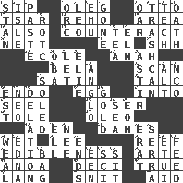 ACROSS 1. Small drink 4. Cassini of fashion 8. "Beetle Bailey" pooch 12. Russian ruler of old 14. San ____ (Riviera town) 15. Length times width 16. In addition 17. Frustrate 20. Remaining after all deductions 21. Snakelike fish 22. Quiet! 23. Learning spot: Fr. 27. Nanny 29. Actor Lugosi 31. Skim 34. Smooth fabric 35. Baby powder 36. Inside; within (prefix) 39. Ovum 41. To the inside or interior of 42. Sew up the eyelids of hawks and falcons 43. Failure 46. Lacquered or enameled metalware 47. Butter sub 48. An important port of Yemen 51. Natives or inhabitants of Denmark 54. Dripping 56. Area sheltered from the wind 58. Coral ridge 61. The property of being fit to eat 66. Johnson of "Laugh-In" 67. Small Philippine buffalo 68. Tenth: prefix 69. Loyal 70. Long (Scottish) 71. In a ____ (agitated or irritated) 72. Help DOWN 1. Comedian Laurel of Laurel & Hardy 2. Small island 3. Thick mixture 4. The grampus (Milton) 5. Lion 6. Australian flightless bird 7. Went 8. Rowing implement 9. File 13 10. Technical work 11. Pledge 13. College mil. group 18. Afternoon social gathering 19. Shade tree 24. Chief or king in Benin or Nigeria 25. Allow 26. Writer Wiesel 28. Moving or stirring 30. White American of non-Hispanic descent 32. Keyboard modifier key 33. Non-commissioned officer (abbr.) 34. Having a sole or soles 36. Eastern Standard Time (abbr.) 37. Modern: prefix 38. Accusation by an informer 40. Gilt 44. Ocean 45. A really long time 49. Pipe bend 50. Born 52. Part of Q.E.F. 53. Father Junipero _ 54. Welt 55. Pulitzer Prize-winning author Ferber 57. Extremities 59. Needle holder 60. Nourish 62. Paper or plastic container 63. Car or cant ending 64. _-fi 65. Be seated