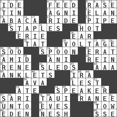 ACROSS 1. Binary compound 4. Nourish 8. Raze (variant) 12. Metal container 13. Hindu god of fire 14. Liveliness 15. Phillipine bananalike plant 18. Travel on an animal 19. Corncob 20. Paper fasteners 22. Being at a high temperature 23. One of the Great Lakes 24. Hearing organ 25. Make lace 26. Electrical Measurement 30. "Barney Miller" actor Jack 33. Soup utensil 36. Part of Q.E.F. 37. Among 39. Cuckoo 40. It's straight from the horse's mouth 41. French philosopher Descartes 42. Bobsleighs 44. American Automobile Association (abbr.) 45. Short socks 47. Lyricist Gershwin 50. Actress Gardner 51. For fear that 53. Had dinner 54. Orator 57. Indian skirt 59. "Change" in Tahitian 61. The wife of a rajah (variant) 63. To (old English) 64. Nights before holidays 65. Pull behind 66. Locale of original sin 67. Tender 68. Compass dir. DOWN 1. Call ___ day 2. Rights 3. Related on the mother's side 4. Conductor's collection 5. The front part of a cuirass 6. Conclude 7. Pass on 8. Newsperson 9. Set down 10. Plant excrement 11. Compass dir. 16. Heavy open wagon 17. Capital of Western Samoa 21. Allows 22. Actor Linden 24. Age 26. Empty area or space 27. Length times width 28. Greek goddess of the earth (variant) 29. Inactive volcano in Sicily 30. "Two Mules for Sister ____" 31. Presage 32. Pig sound 34. Friends 35. Single 38. Accusation by an informer 42. R.R. building 43. Drop; flow; fall 46. First lady 48. Hitchcock's "____ Window" 49. "____ silly question..." 52. Portable shelters 53. Johnson of "Laugh-In" 54. Institutes legal proceedings 55. Expression of disdain 56. Vintage cars 57. Take to court 58. Also 59. Nine, plus one 60. "___ Maria" 62. She-sheep