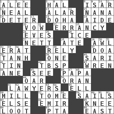 ACROSS 1. Toward shelter 5. Actor Linden 8. Austrian river, tributary to the Danube 12. Anneal 13. Having or resembling wings 15. Nanny 16. Prevent from occurring 18. Capital of the state of Qatar 19. Assistant 20. Promise 22. The state or an instance of erring 24. Nights before holidays 26. Frozen water 27. Remaining after all deductions 28. Had dinner 29. Leather borer 32. Part of Q.E.F. 35. Have trust in 37. ___ good deed 38. Hyperbolic tangent 39. Single 40. Indian skirt 41. Shallow baking pan 42. Cook's measure (abbr.) 43. Songbird 44. A saturated hydrocarbon 45. Perceive with the eye 46. Dad 49. Rowing implement 50. Northwest Algerian city 51. Those who practice law 55. Pipe bend 56. Place where flour is made 57. Heavy book 59. Moves on water 63. Otherwise 64. Independent ruler or chieftain 65. Leg joint 66. Spoils 67. Parent Teacher Association (abbr.) 68. Compass direction DOWN 1. Also 2. Area sheltered from the wind 3. Erode 4. Veterans Day date 5. Possessed 6. Medicinal plant 7. Cowardly lion portrayer 8. Lacking in sense or substance 9. Ketch in the Levant 10. "60 Minutes" Commentator Rooney 11. Actress Charlotte 14. Noteworthy scarcity 17. Be footloose 21. Soggy 23. Adept person 25. Disco prop 28. City in Syria 29. The sixth month of the Jewish calendar 30. Had on 31. (Had) reclined 32. Singer James 33. Water falling in drops from the sky 34. Queen of England 1702-14 36. Followers of ems 40. Tchaikovsky ballet 42. Cylindrical with tapered ends 45. Declare 47. "We ___ not amused" (Victoria) 48. Friends 49. A small or young owl 51. _ and Stitch 52. In addition 53. Play 54. Stricken, poetically 56. Cartoonist voice _ Blanc 58. Epoch 60. _ tizzy (2 wds.) 61. French article 62. Arrange properly for use