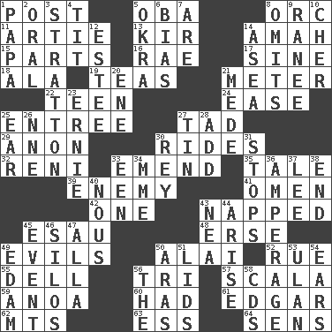 ACROSS 1. Mail 5. Chief or king in Benin or Nigeria 8. The grampus (Milton) 11. Nick name for Arthur 13. Apertif with cassis 14. Nanny 15. Components 16. Actress Charlotte 17. Trig term 18. In the manner of 19. Beverages made from leaves 21. Distance measurement 22. Adolescent 24. Comfort 25. Main course 27. Small amount or degree 29. At once, immediately (arch.) 30. Amusement-park features 32. Painter Guido (1575-1642) 33. Make improvements or corrections to 35. Story 39. Foe 41. Presage 42. Single 43. Slept 45. Son of Isaac 48. Celtic language 49. Vices 50. Jai ____ 52. Regret 55. Small valley 56. Three (prefix) 57. Any of the three canals of the cochlea 59. Small Philippine buffalo 60. Possessed 61. _ Allan Poe 62. Mountains (abbr.) 63. Double-curved letter 64. Elected reps. DOWN 1. Dad 2. Spoken 3. Ski resort town in Vermont 4. Teat (slang) 5. Gumbo ingredient 6. Prejudice 7. "We ___ not amused" (Victoria) 8. Leaves out 9. Indian princess (variant) 10. "Mermaids" star 12. First name in cosmetics 14. Toward the sea 20. Compass dir. 21. Ancient Persian 23. Bert's buddy 25. Ewer handle 26. Compass dir. 27. Shallow baking pan 28. Find the sum of 30. Marina Del _, California 31. Halts 33. Car or cant ending 34. Madame (abbr.) 36. Electrical Measurement 37. Area sheltered from the wind 38. Conclusion 40. Horse sense 43. Teachers' org. 44. Originate 45. Happening 46. Grain storage towers 47. Silent film actress Nazimova 49. Dutch treat 50. Caspian sea tributary 51. Flaplike coverings 53. Uhlan (variant) 54. Hearing organs 56. Definite Article 58. Music discs