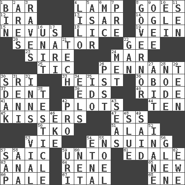 ACROSS 1. Tavern 4. Desk light 8. Travels 12. Lyricist Gershwin 13. Austrian river, tributary to the Danube 14. Stare at amorously 15. Congenital growth or mark on the skin 18. Louse (plural) 19. Distinctive style or manner 20. Elected representative 22. Unit of force equal to gravity 23. Title for a man of rank and authority 24. Make imperfect 25. Nervous spasm 26. Pre-World Series prize 30. Indian title of respect (Mr.) 33. Robbery 36. Mitch Miller's instrument 37. Scratch 39. Begley and Asner 40. Travel on an animal 41. Queen of England 1702-14 42. Graphs 44. "___ Little Indians" 45. Smoochers 47. Curvy letter 50. Ring climax 51. Mountain range southwest of Kyrgyzstan 53. Compete 54. Following as a consequence or result 57. Ketch in the Levant 59. To (old English) 61. Peak District village in England 63. Of or related to the anus 64. French philosopher Descartes 65. ___ Haven, CT 66. Light colored 67. Slanted text style (abbr.) 68. Compass dir. DOWN 1. Storage container 2. Ancient Greek god of war 3. All-night dance parties 4. _ and Stitch 5. SW Saudi Arabia district 6. Apple computer (short form) 7. Before (prefix) 8. Head of state? 9. Double curve, resembling the letter S 10. Biblical high priest 11. Elected rep. 16. A single undivided whole 17. Indian skirt 21. Technical work 22. Separate the seeds from cotton 24. Was introduced to 26. Inconspicuous attention getter 27. "This won't hurt ____!" 28. Connecting point 29. Adolescent 30. Neighbor of Neb. 31. Painter Guido (1575-1642) 32. Taverns 34. Snakelike fish 35. Wedding promise 38. A testis 42. Adept person 43. Oceans 46. Make supply last 48. Turn sharply 49. Stated 52. Empty; void 53. Small bottle 54. Inactive volcano in Sicily 55. Christmas carol 56. Small, secluded valley 57. Plant excrement 58. Santa ___, CA 59. RI univ. 60. Fish or hair follower 62. She-sheep